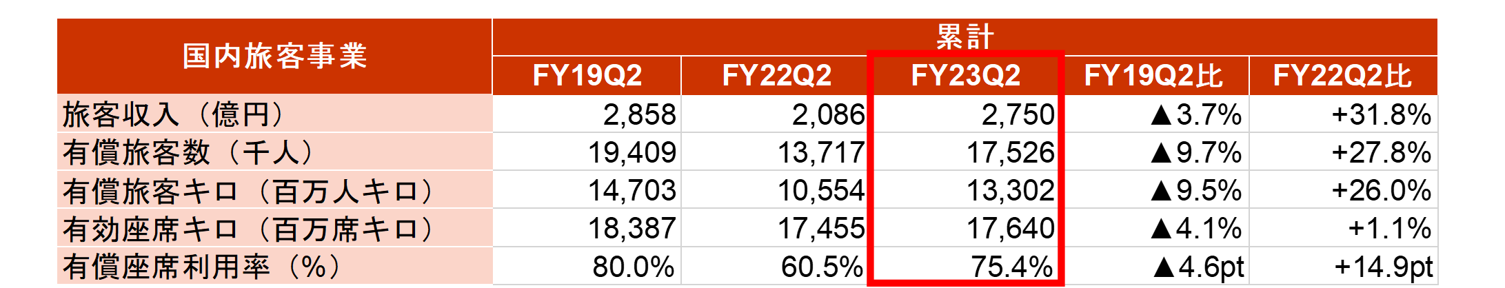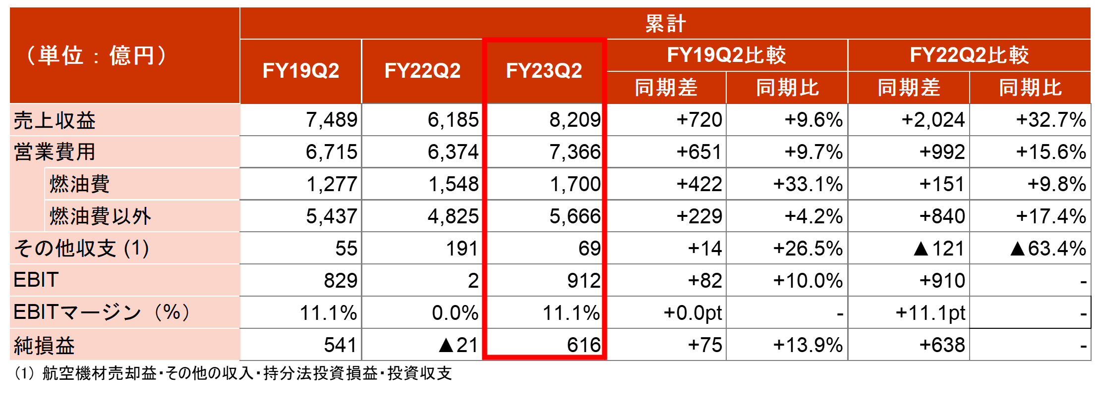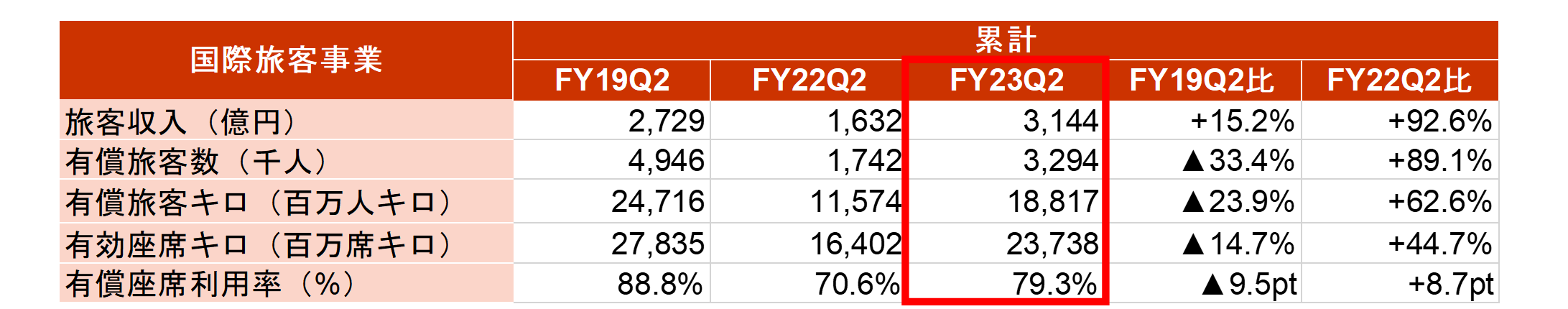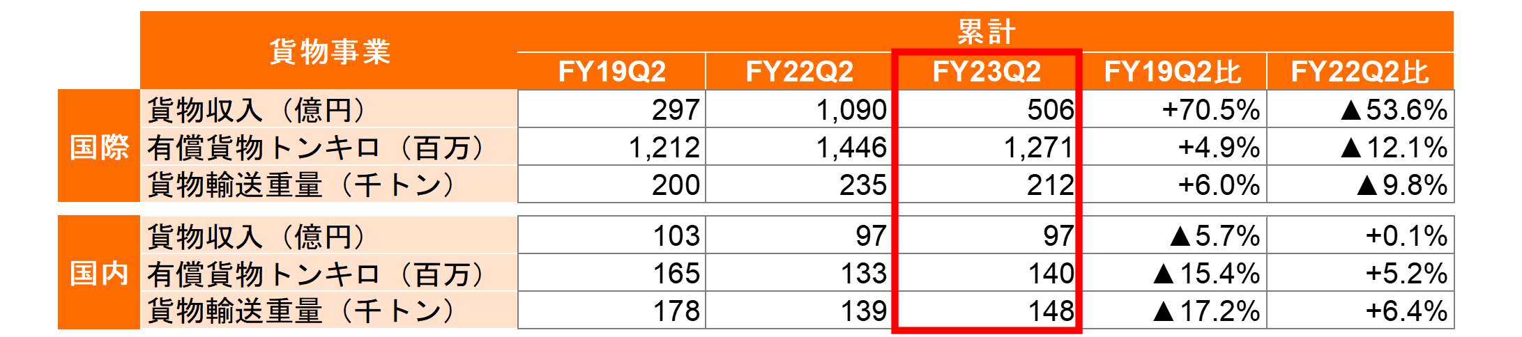 第1四半期に引き続き、第2四半期においても国際旅客は好調な海外発需要に加え、日本発需要も回復基調にあり、当社の期初時点の想定を上回って推移しました。また、国内旅客についても観光需要がコロナ前同水準の旅客数まで順調に回復するなど、航空旅客需要は全体的に順調な回復がみられました。