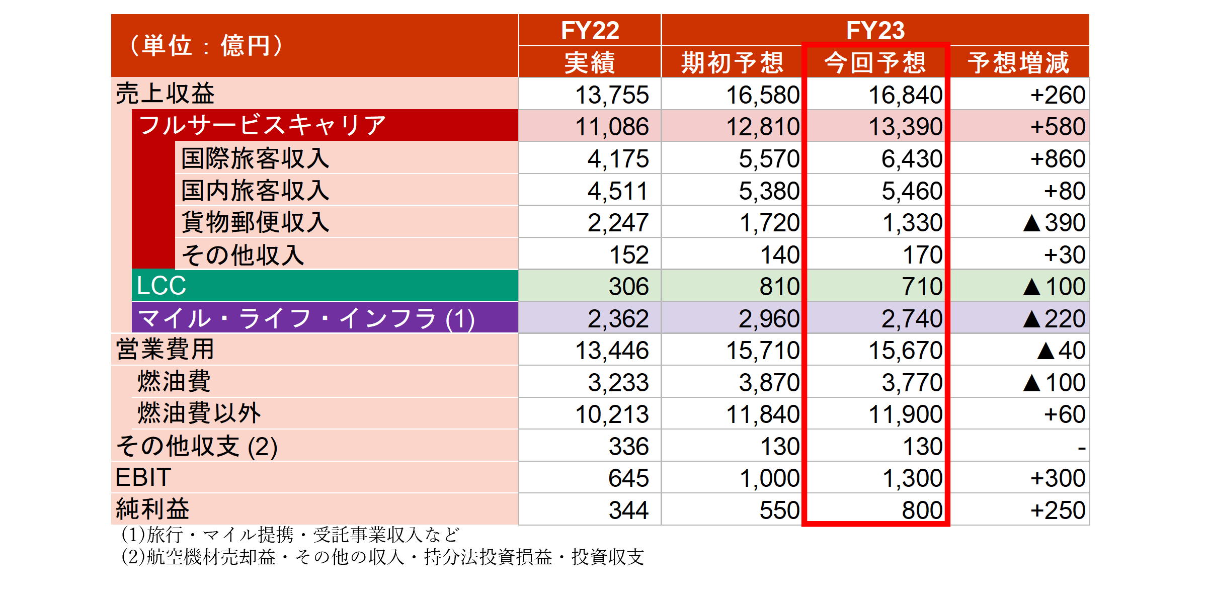 なお、予想の算出に当たり、当下期における米ドル円為替レートは145円、航空燃油費の一指標であるシンガポール・ケロシンの市場価格を1バレルあたり120米ドルとしています。