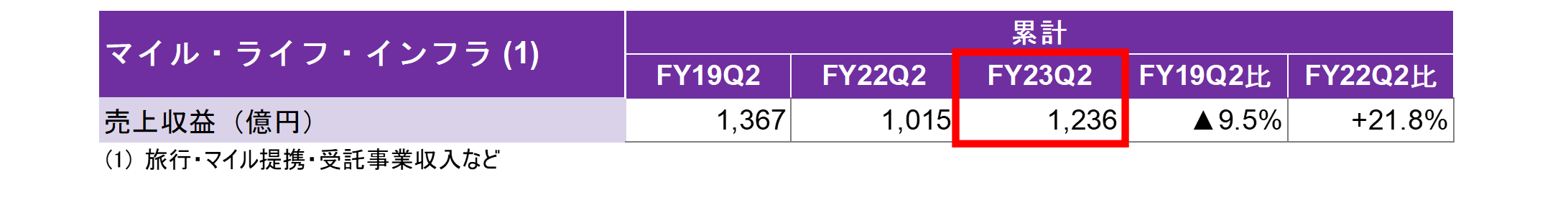 売上収益は前年比約1.2倍となりました。4月より国内線でも開始した、混雑する時期でもマイルで予約できる「特典航空券PLUS」のご利用も増えました。引き続き、マイルのためやすさ・使いやすさ向上に取り組んでまいります。また空港受け入れ体制を強化し、海外航空会社の空港ハンドリング受託便数の拡大も進めてまいります。