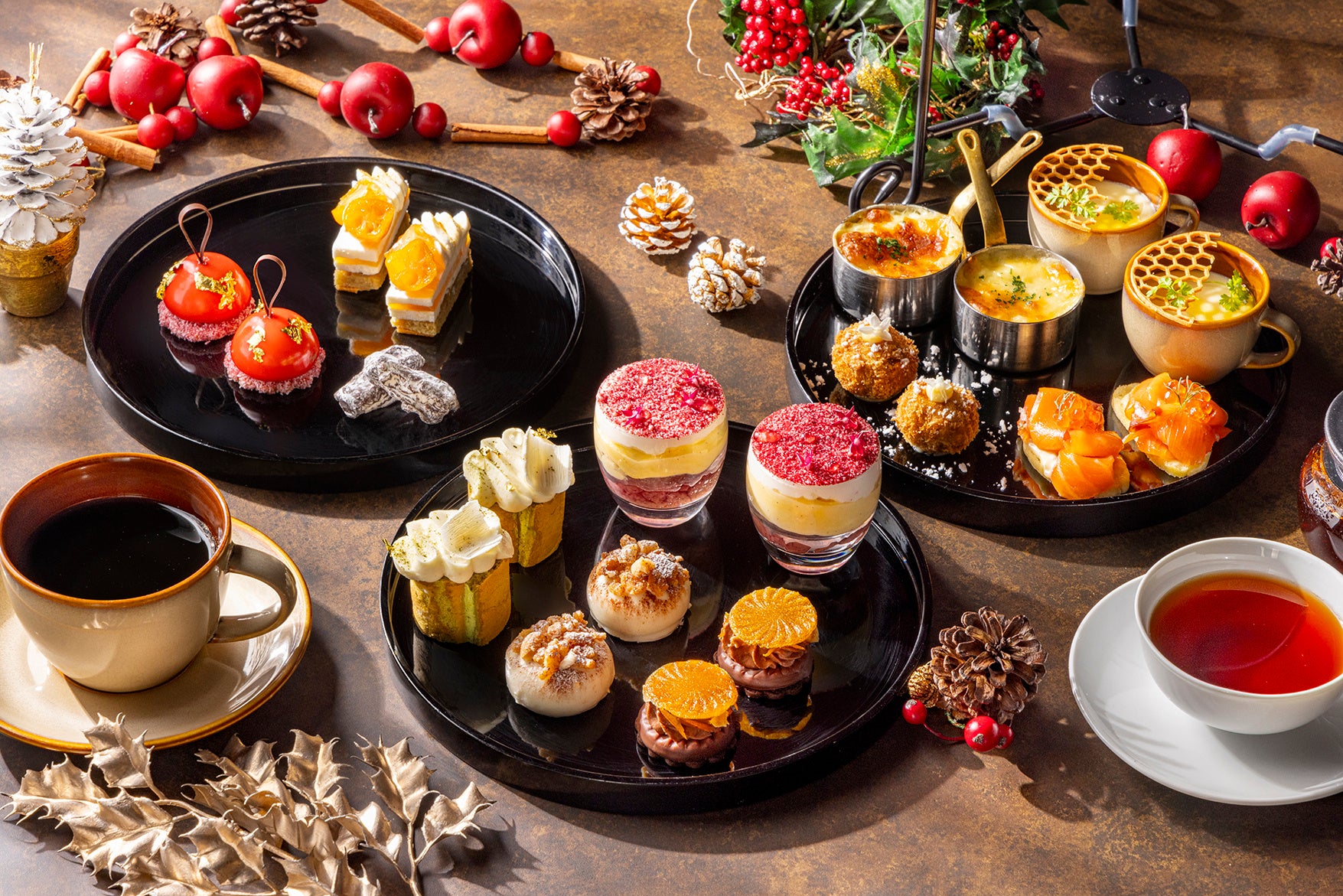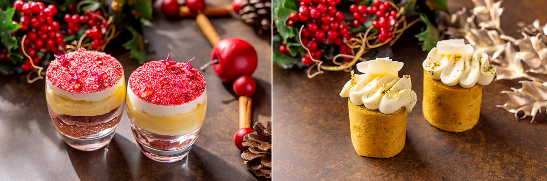 クリスマスアフタヌーンティーでは、暖かなクリスマスプレゼントをイメージした甘く贅沢な7品のスイーツと4品のセイボリーをご用意いたしました。見た目にもかわいらしいクリスマスのオーナメントをかたどった「ホワイトチョコレートとラズベリーのムース」や、コーヒー風味の中にピリッと異国のスパイスが香る「五香粉ティラミス」、赤ワインで大人のテイストに仕上げた「赤ワインのサヴァラン」など、プルマン東京田町が贈る、ひとつひとつ丁寧にこだわった繊細なスイーツがクリスマスギフトのように並びます。