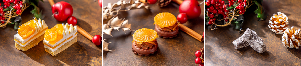 (左)金柑とリコッタチーズのケーキ (中) オレンジとプラリネショコラタルト(右)ミュスカディーヌ