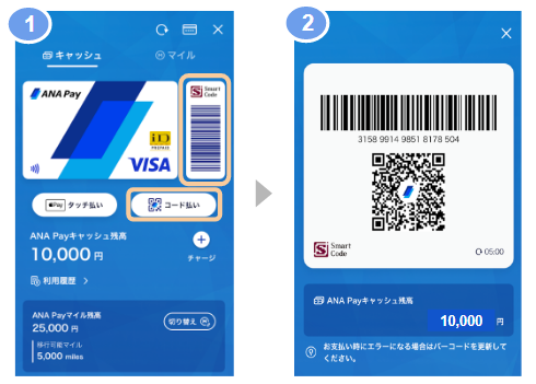 ①ANA Payホーム画面のコード払いボタンまたはSmart Codeバーコードをタップ