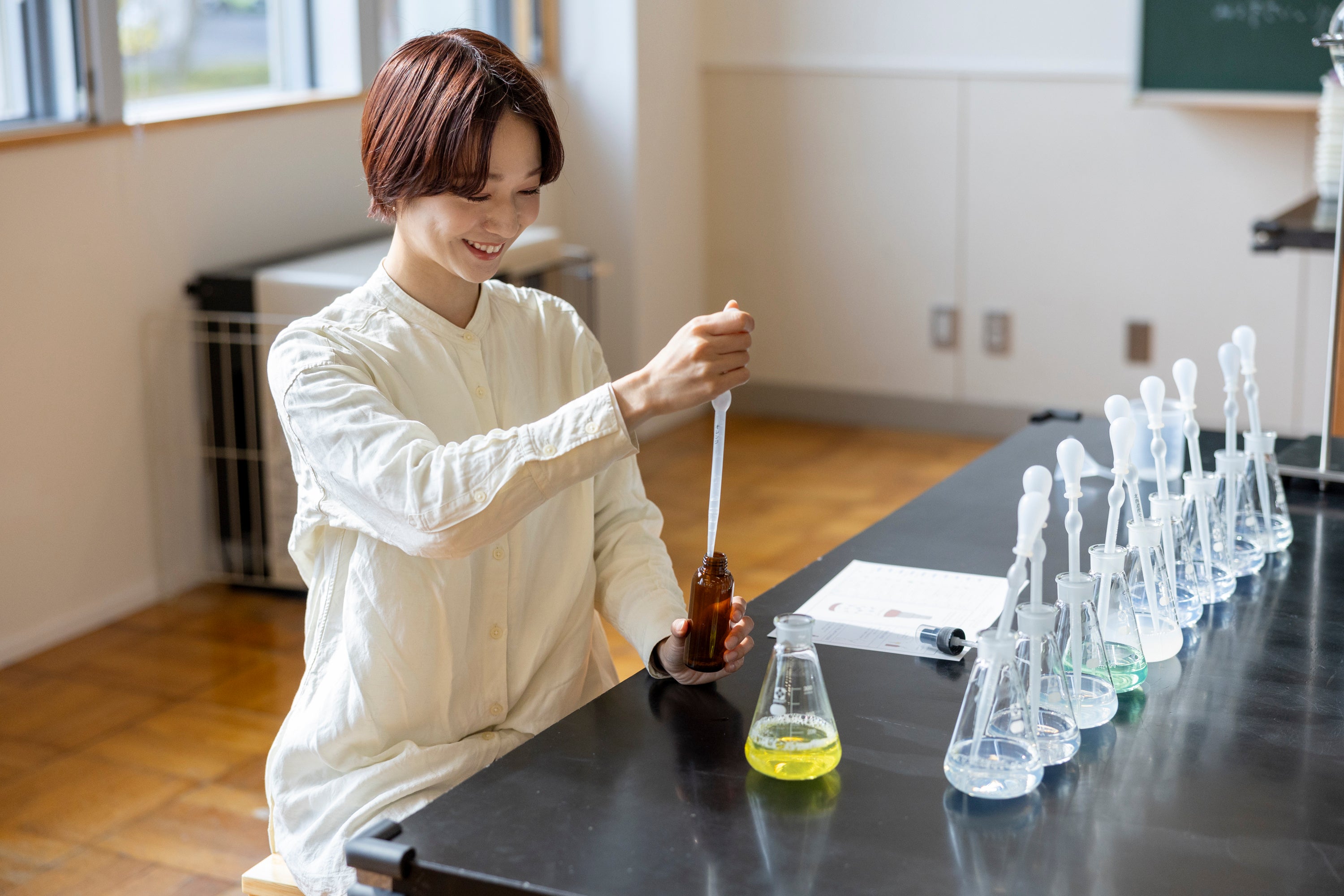 会場となる「蒸留実験室」は学校で使われていた机や椅子、黒板などの備品を再活用しているため、まるで学校の理科室のよう。また使う器具は三角フラスコや分液ロートなど本格的な実験器具が並び、スキンケアメーカーの研究者になったような気持ちで調香を体験いただけます。