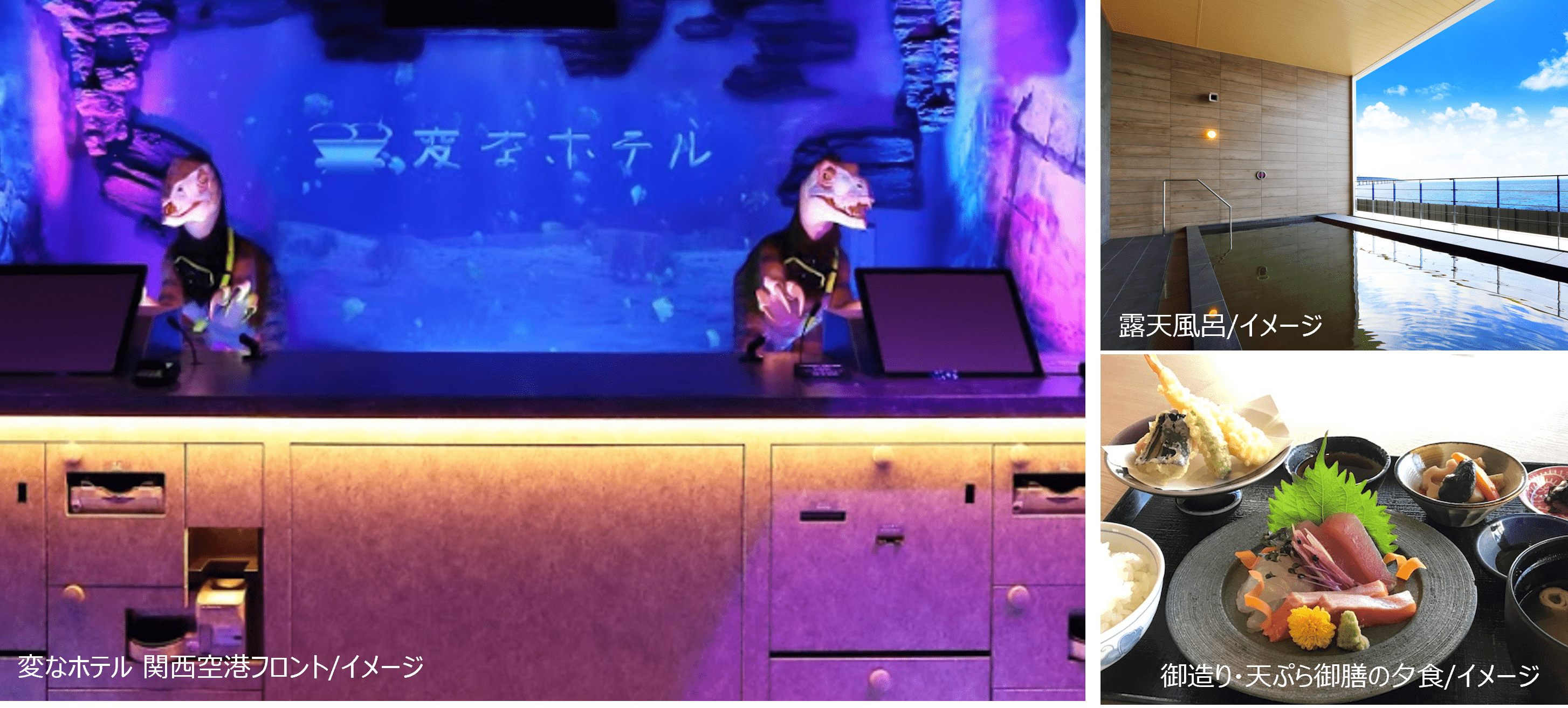 変なホテル 関西空港は、フロントでは恐竜ロボットがチェックインを担当し、ロビーには無料でご利用いただけるマンガコーナーを設けております。客室にはコンシェルジュロボット、大画面シアター、世界中のアスリートから支持されているファイテン社のアクアチタン技術を採用しております。オープン4周年を迎え、オーシャンビューの客室にご宿泊で、ホテル内の天然温泉施設のアクアイグニス 関西空港 泉州温泉をご利用いただけ、和食レストラン青庵での御造りと天ぷら御膳の夕食と和食ビュッフェ朝食の2食付の特別プランを発売いたします。9,800円~(1名様1泊、夕食・朝食付、入湯税150円別、税サ込)