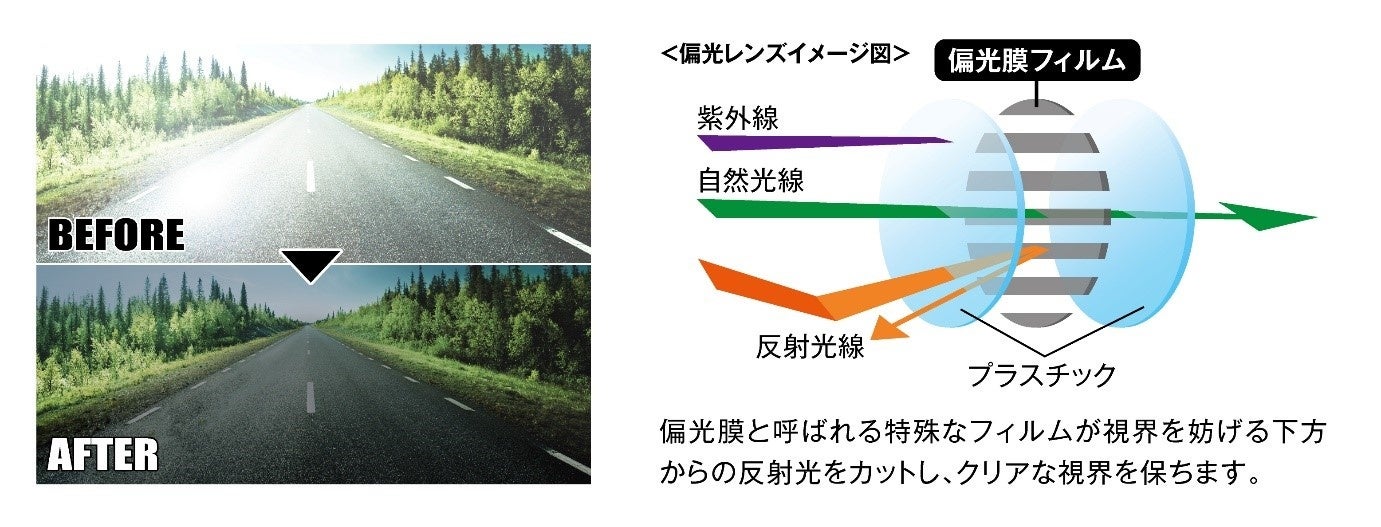 路面や水面、雪面など様々な物体からの乱反射を効果的にカットする特殊なフィルター機能を持ったレンズです。フィッシング時では水面からの眩しさを抑え透明な水面下の状況を見て知ることができることで、より適切なキャスティングが可能になり釣果を上げやすくなります。アウトドアにおいても、眩しさだけでなく反射によるギラつきも軽減し、アクティビティの快適性を向上させます。