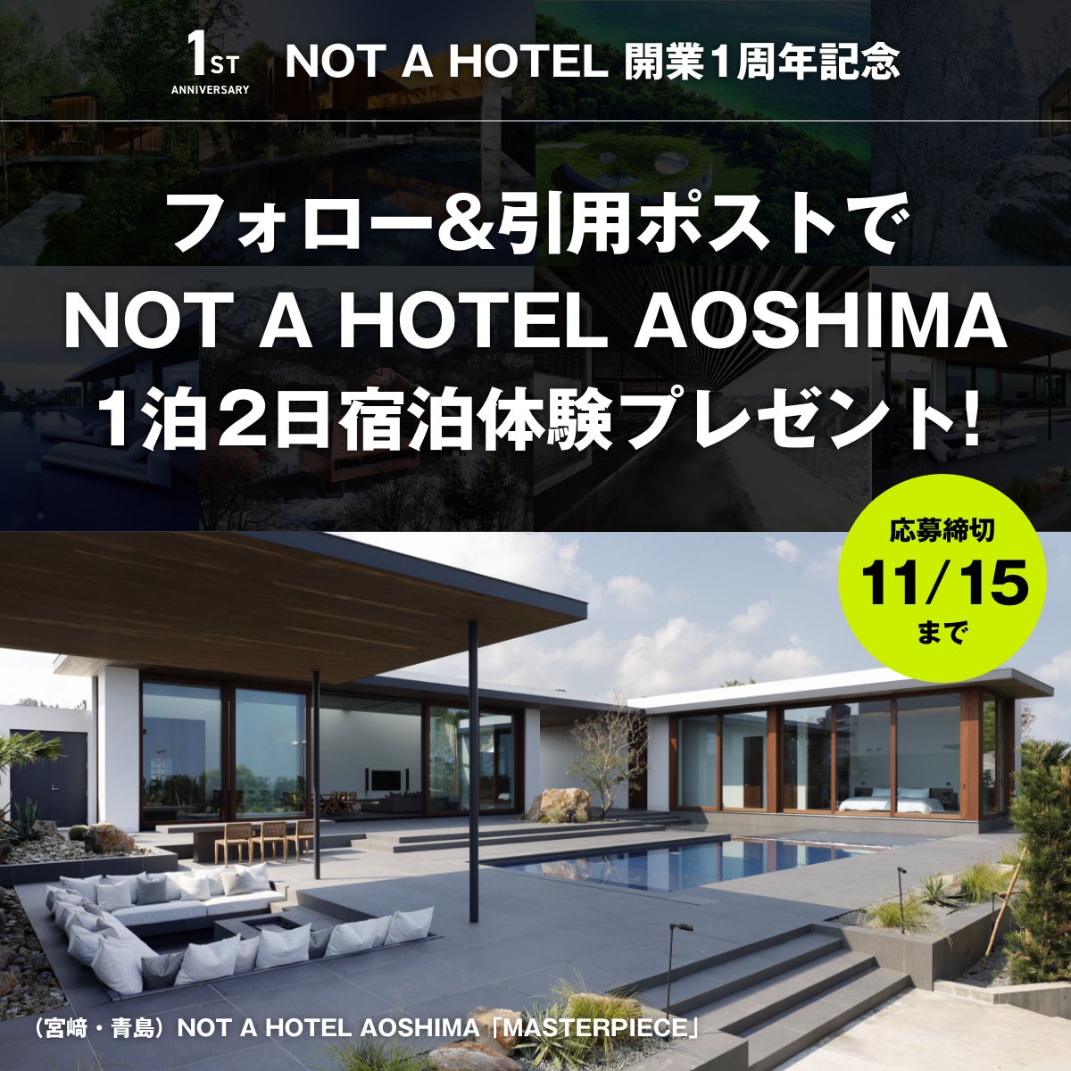 ◼️ 開業1周年を記念し、NOT A HOTEL AOSHIMA「MASTERPIECE」1泊2日宿泊体験プレゼントキャンペーンを開催。