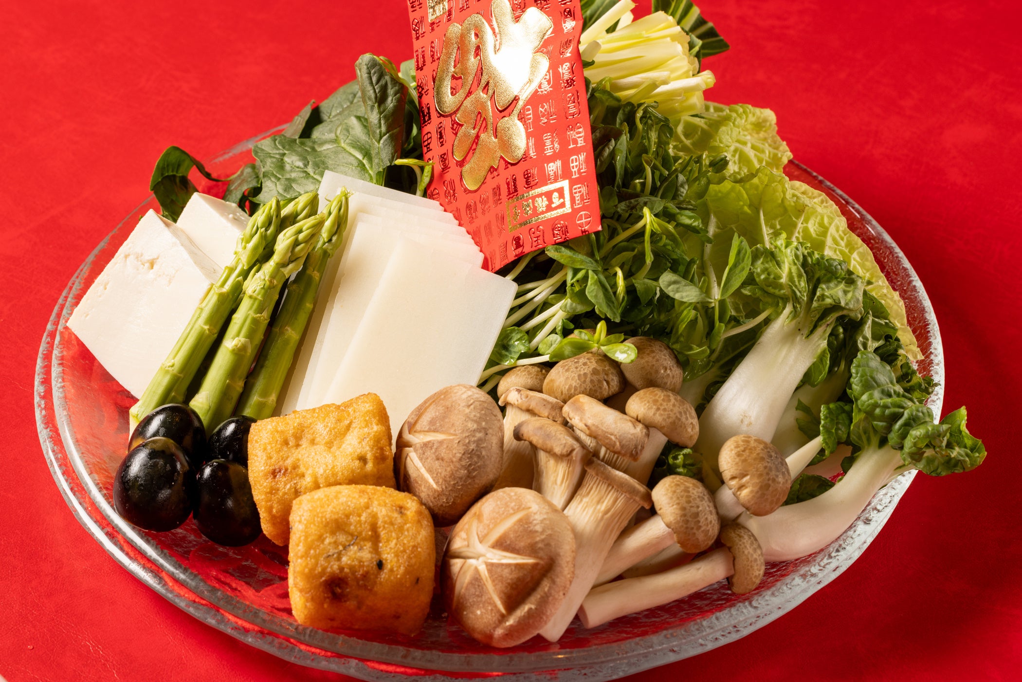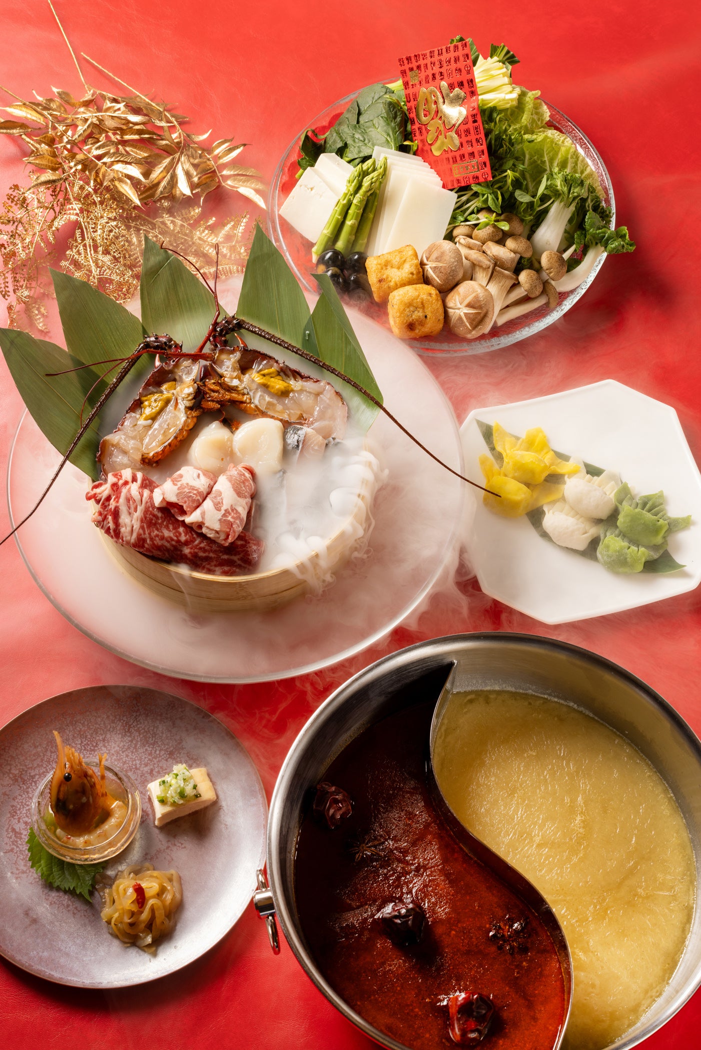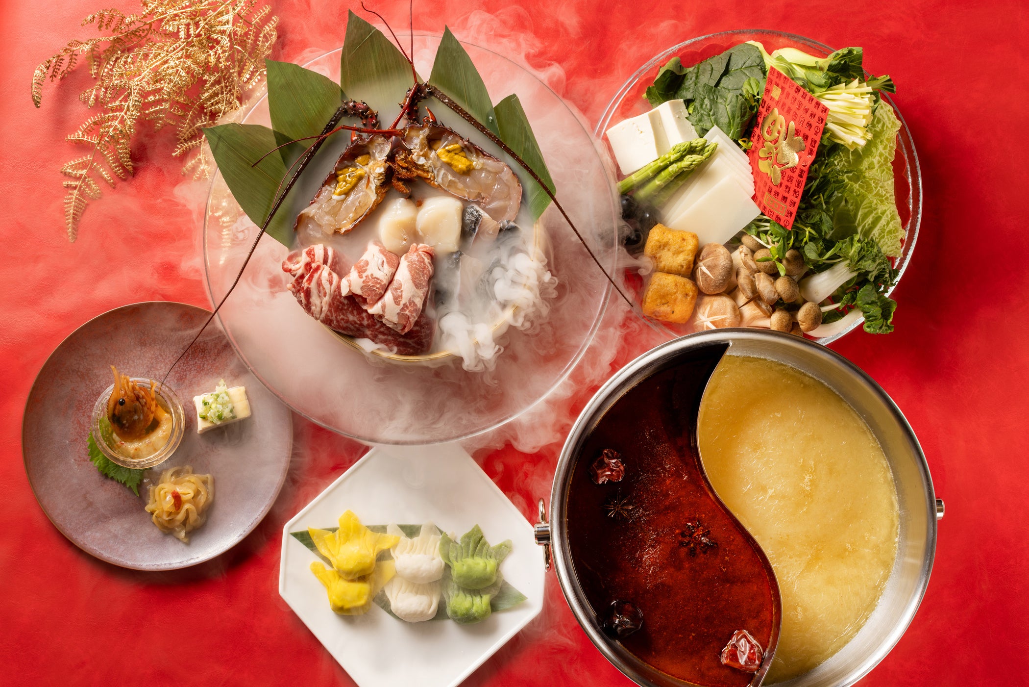 今年の「開運火鍋」には、ハレの日の食卓を飾る縁起物の伊勢海老(龍蝦)やミネラルも豊富で冷えにも効果があり、立身出世の象徴である鯉、がんもどき(飛竜頭)、アスパラバス(龍髭菜)など、干支の「辰」にちなんだ食材をご用意いたします。金運(黄)、恋愛運(ピンク)、健康運(緑)を願った三色プレミアム水餃子では、フォアグラや、キャビア、ツバメの巣など、新年にふさわしい高級食材を包み込みました。一見すると白い餃子は、スープをくぐらせると中の海老に火が通ることにより全体がほんのりピンクに色づきます。そのほか、キメの細かいサシが入った松坂豚や舌触りが良い十勝ハーブ牛、肉厚な帆立貝、栄養価も高くヘルシーな3種のキノコ、白菜やチンゲン菜、黄ニラなど国産の野菜などを揃えました。厳選した山海の幸を、コラーゲンたっぷりの白湯スープと9種類の香辛料が入った麻辣スープ、自家製の新年のお祝いにふさわしい紅白の2種のスープにくぐらせてお召し上がりください。