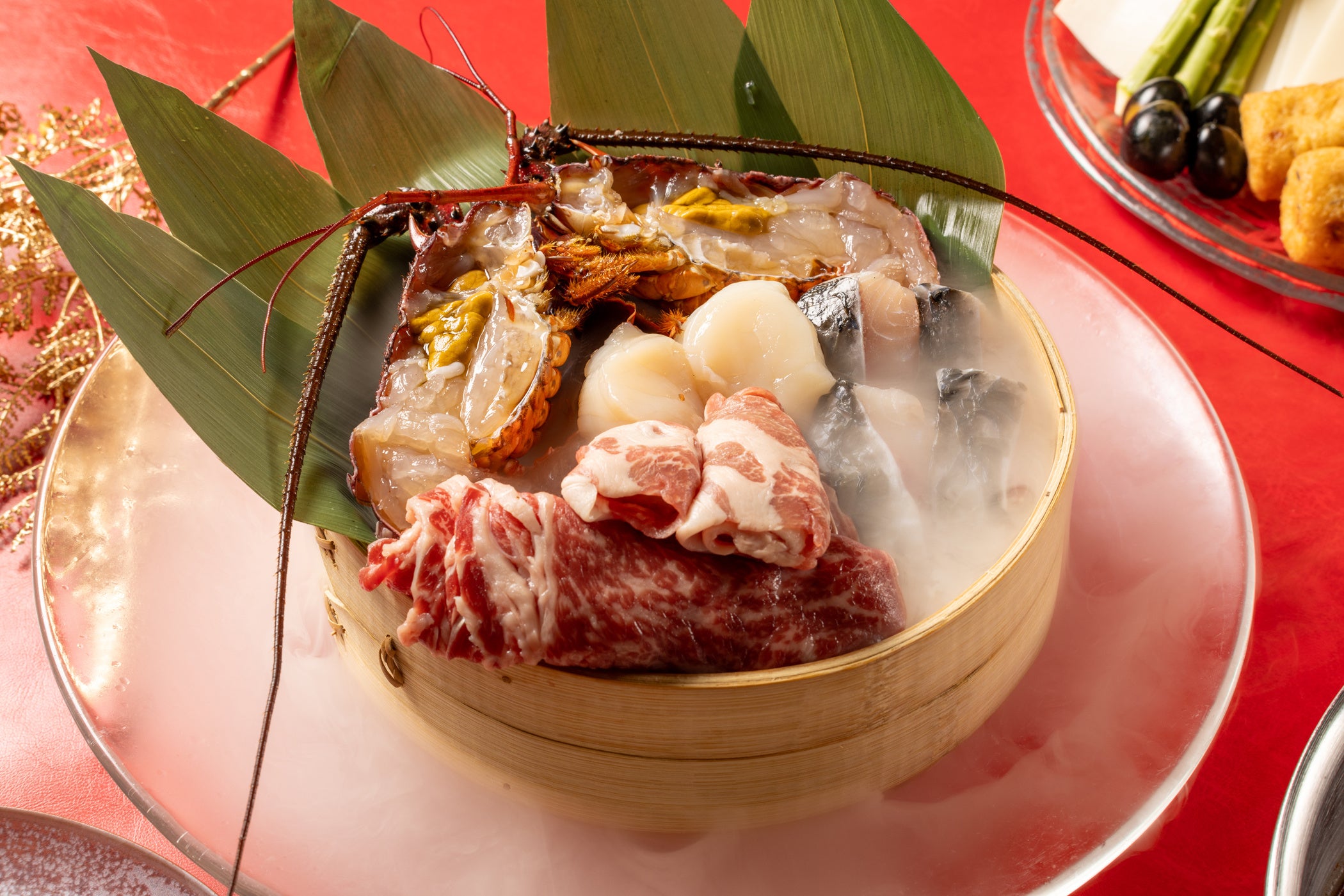 中国各地の代表的な料理や本格的な飲茶をお召し上がりいただける中国料理「チャイナルーム」では、新年の幸運を願う「開運火鍋」の新作として「開運ドラゴン火鍋」をご用意いたします。2024年の干支である「辰」にちなんだ「龍」や「竜」がつく食材をはじめ、新年にふさわしい高級食材を織り交ぜてご用意いたします。メインの龍に見立てた「伊勢海老(龍蝦)」と、滝を登りきると龍になると言い伝えられている「鯉」は、雲海から現れる龍をイメージし煙を纏って登場。まるで神話の中のドランゴンを想起させるような、シェフの遊び心あふれるムービージェニックな演出もお楽しみください。そのほか、キャビアやツバメの巣をつかった金運(黄)、恋愛運(ピンク)、健康運(緑)を願った三色プレミアム水餃子や、厳選した山海の幸を、おめでたい紅白のコラーゲンたっぷりで滋味深いスープでお召し上がりください。