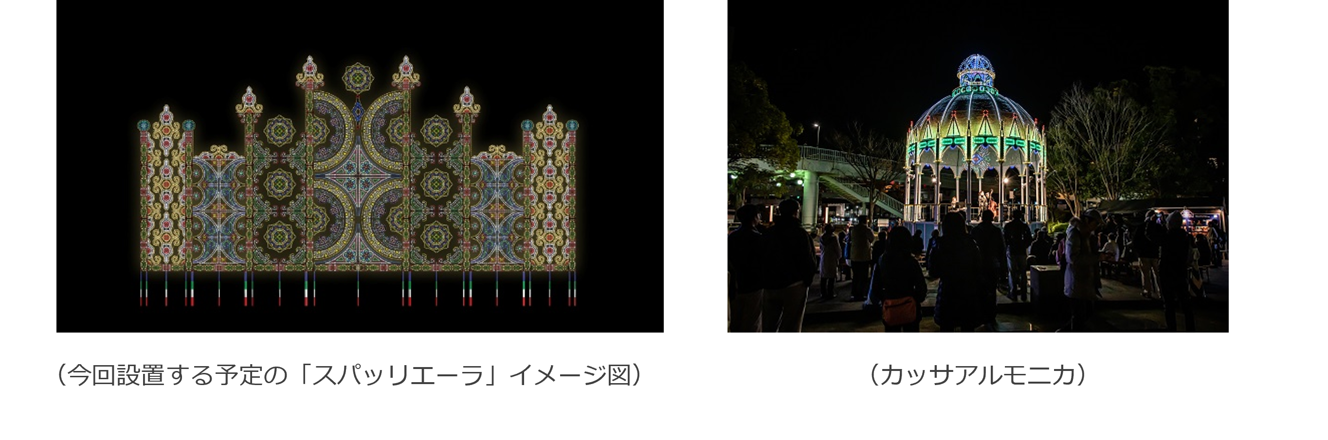 また、旧外国人居留地を中心に高さ約3m~8mのルミナリエ作品を各所に点在させることで回遊性の向上を促進します。