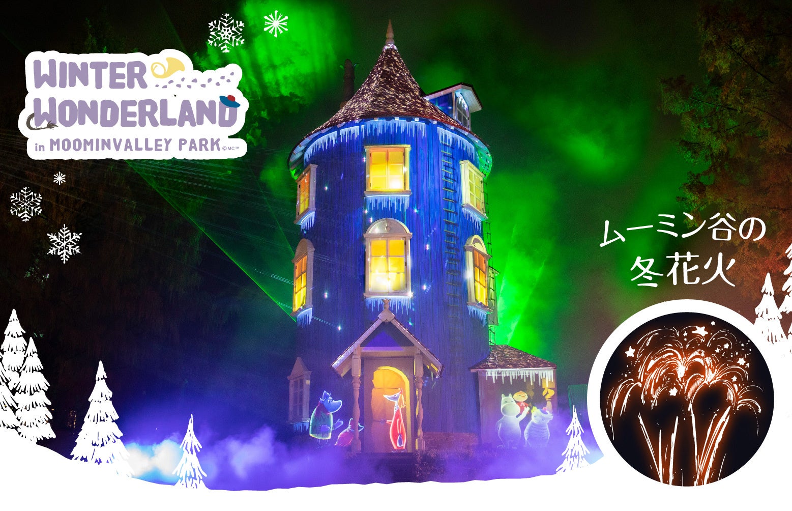 幻想的なオーロラとムーミン屋敷に映し出されるプロジェクションマッピングと特別開催の湖面から打ち上がる『ムーミン谷の冬花火』もお楽しみいただけます。