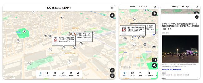 地域情報サイト「神戸ジャーナル」で発信している、神戸市に特化したグルメやニュース、開店情報などの既存の記事をリアルタイム連携、デジタルマップを通じて提供することで、ユーザーは自身がいる場所の出来事や情報を直感的に把握・閲覧でき、偶発的な出会いを得ることができます。