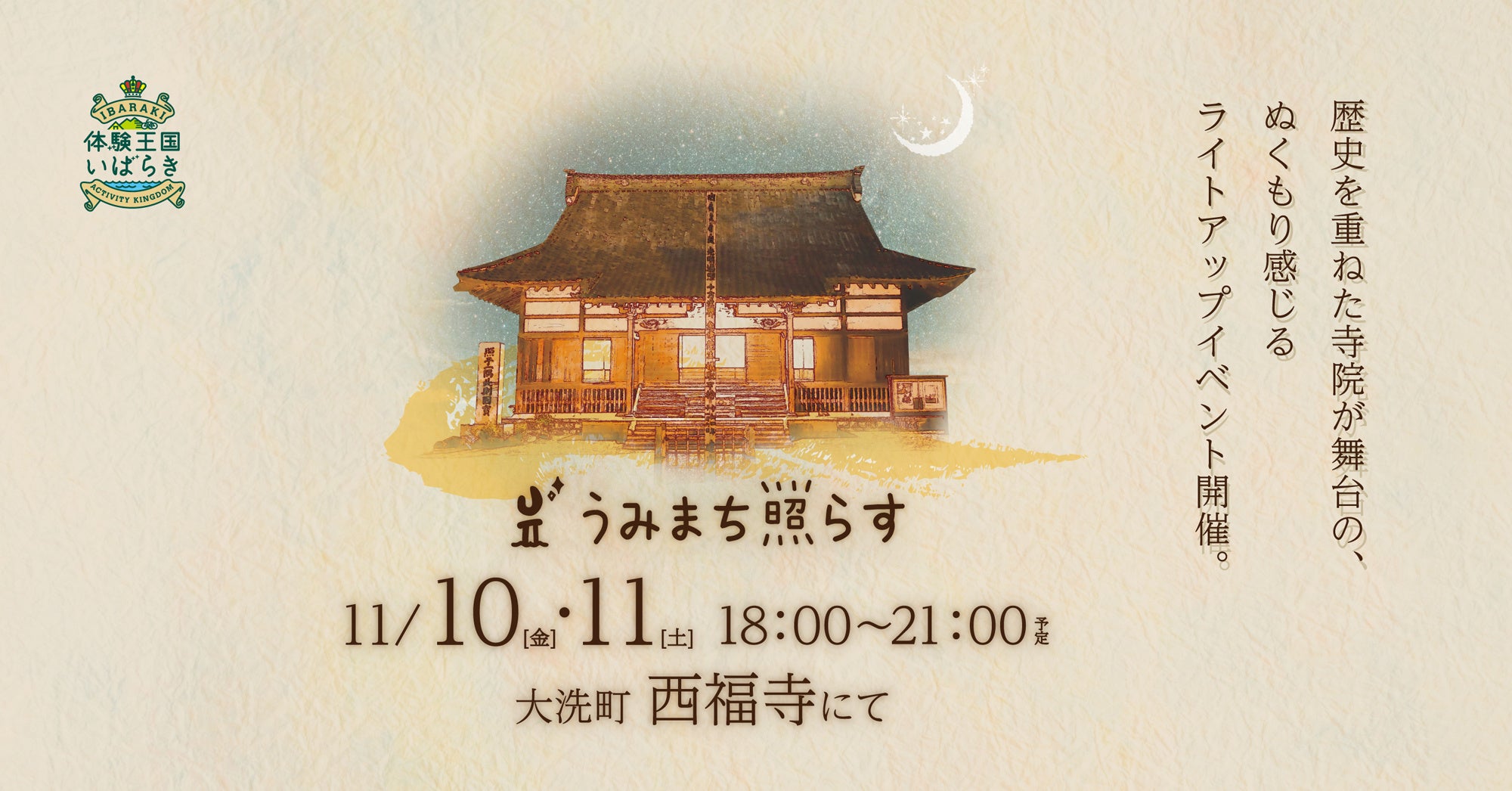 幻想的にライトアップすることで、既存観光施設の新たな魅⼒を発掘していくことを⽬的にスタートした、⼤洗ひかりのアートプロジェクト「うみまち照らす」。2023年11⽉10⽇(⾦)・11⽇(⼟)は、町の中⼼にある曲がり松商店街の⼭側に位置し、古くから町の⼈々の信仰を集めている「⻄福寺」で⾏われます。