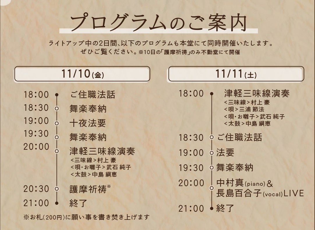 10⽇(⾦)18:00の住職の法話からスタートし、20:30からは護摩祈祷も⾏われます。幻想的な雰囲気の中、舞楽奉納(10⽇18:30〜、11⽇19:30〜)、津軽三味線演奏(10⽇20:00〜、11⽇18:00〜)やジャズ演奏(11⽇20:00〜)など、普段と全く違う雰囲気に境内が包まれます。