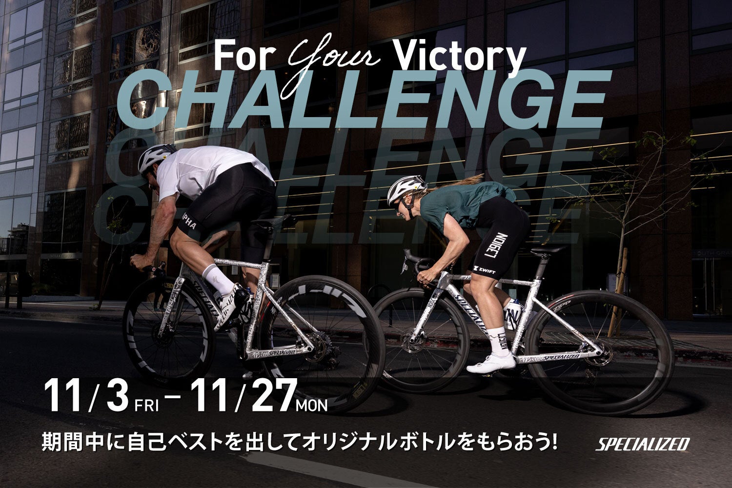 全国のスペシャライズドストアでは2023年11月3日(金)〜27日(月)まで「For Your Victory Challenge」を開催。自己ベストを更新して「勝利」を共有したライダーに、オリジナルボトルをプレゼント。あらゆる挑戦を後押しし、サイクリングを通じて活気ある毎日を送ることをサポートする。