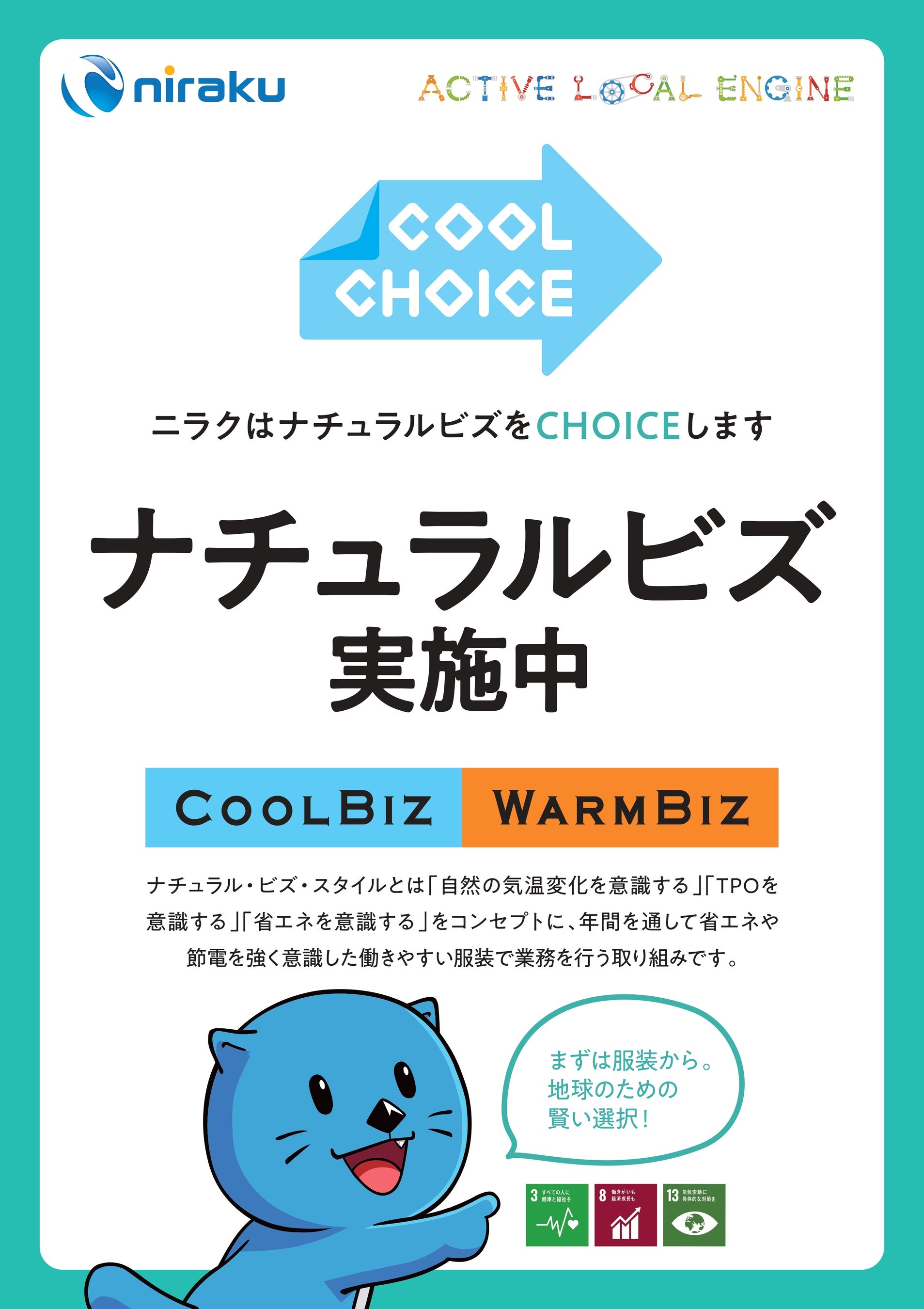 ニラクは「地球に感謝し、企業活動で発生する環境負荷を減少させるとともに、個人の環境保全活動を可能な限り支援する」という方針のもと、これまでにも、地球温暖化対策の一環として、CO2削減の観点から、過度な空調に頼らずに軽装で業務を行う「クールビズ」に期間を指定して取り組んできました。