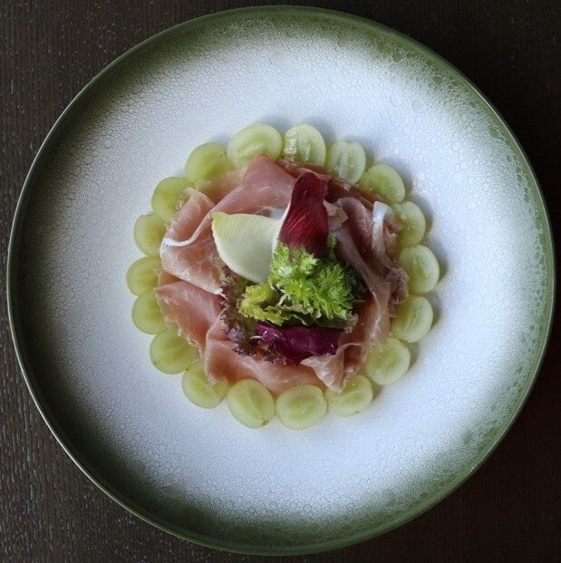 アルヴァのオープン当初からシグネチャーディッシュとして常時提供しているカステルフランコのサラダは、季節のフルーツを添えて、全体のバランスを整えています。甘みの強いGREENCOLLARのぶどうが、小粒ではあるものの大きな存在感を発揮しています。