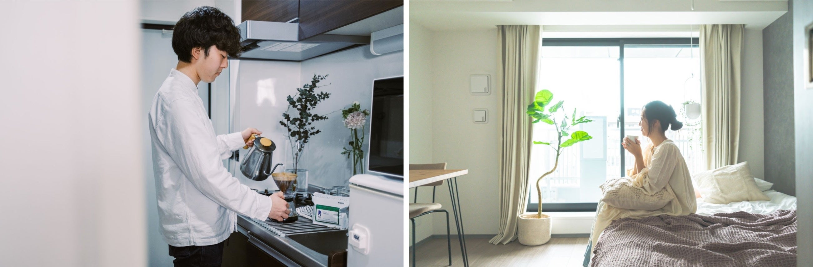 家具・家電・日用消耗品、そして、Wi-Fiや水道・電気・ガスなどのインフラ完備、必要な着替えや仕事の荷物のみで住み始めることができます。また、お部屋探しから、内見、契約までワンストップでオンライン完結し、最短即日から入居可能です。