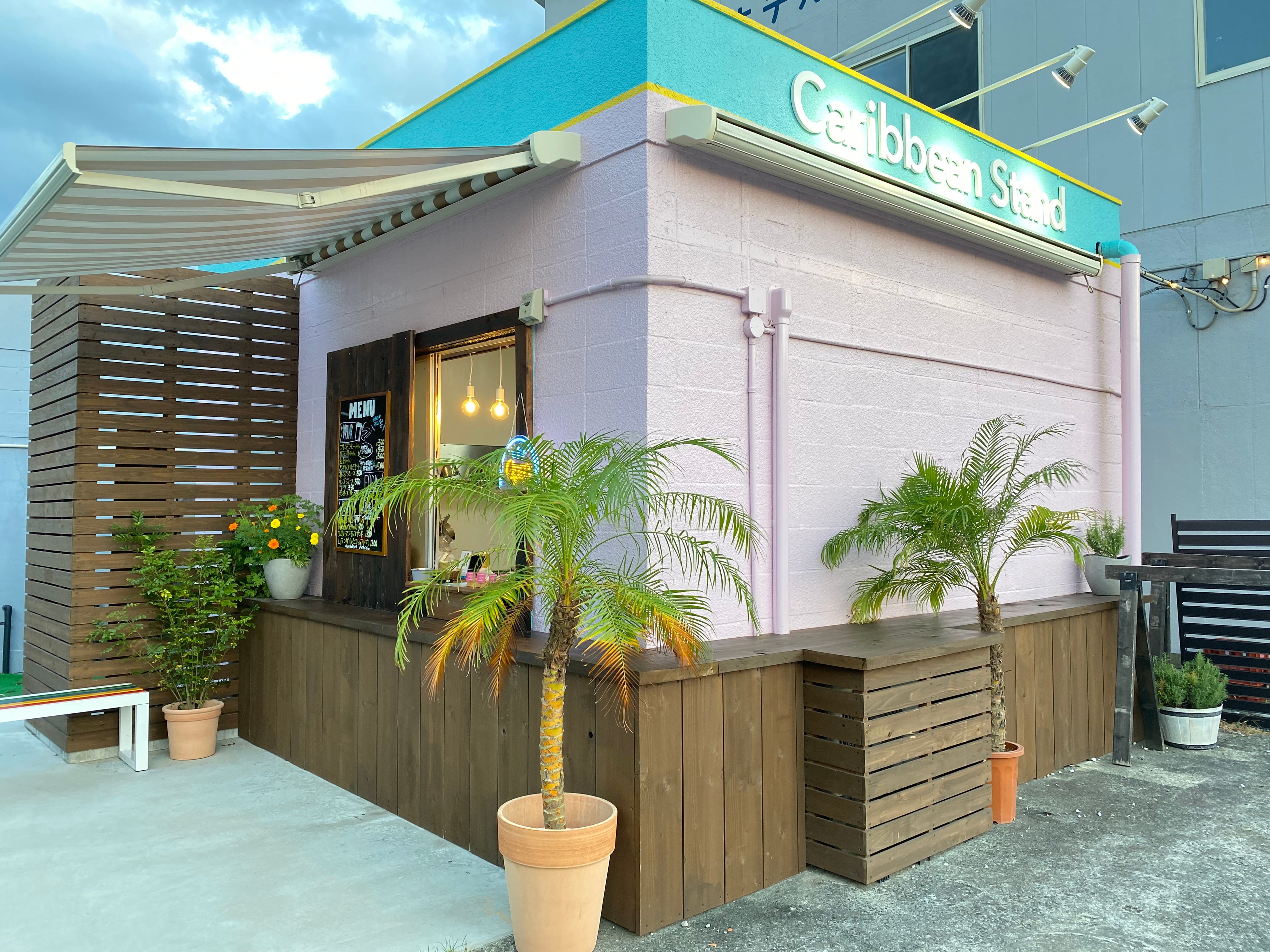 『Caribbean Stand 』の外装はラム酒の名産国であるカリブ海最大の島国、キューバ・ハバナの街並みから着想を得てデザインが決まりました。淡いピンク色を ベースにエメラルドグリーンと黄色を差し色に、今まで南房総では出会ったことのないコーヒースタンドです。