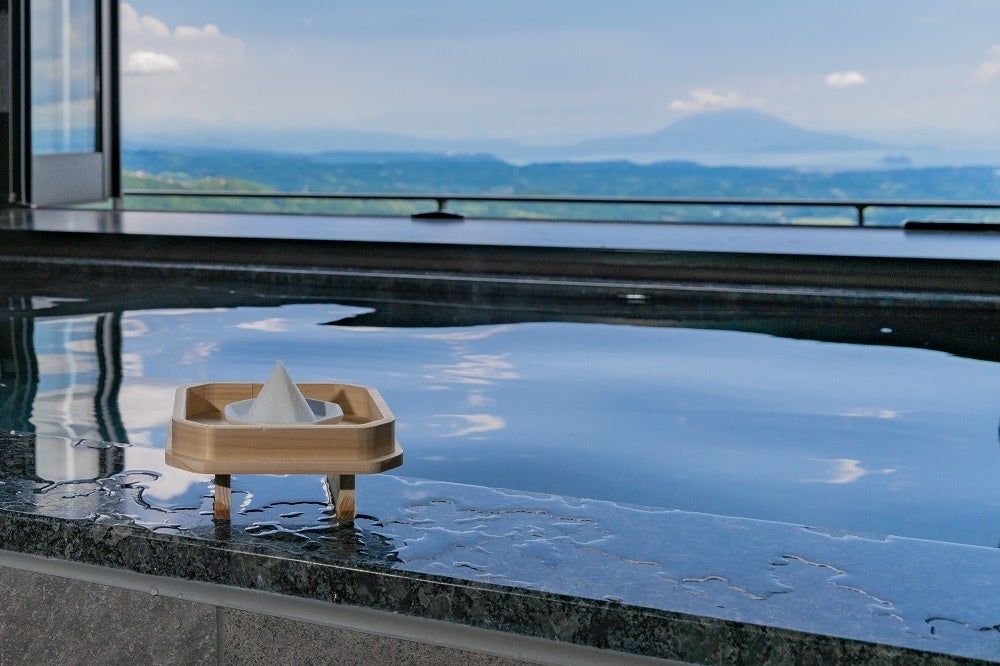 桜島や錦江湾を見渡すことのできる客室露天風呂では、霧島神宮への参拝に備えて「撤下神饌の清め塩」で心身を清めます。用意する塩は、霧島神宮で日々斎行されている祭典でご神前へお供えされた神饌です。神様が嫌う穢れを祓い、神様に思いを届ける準備をします。