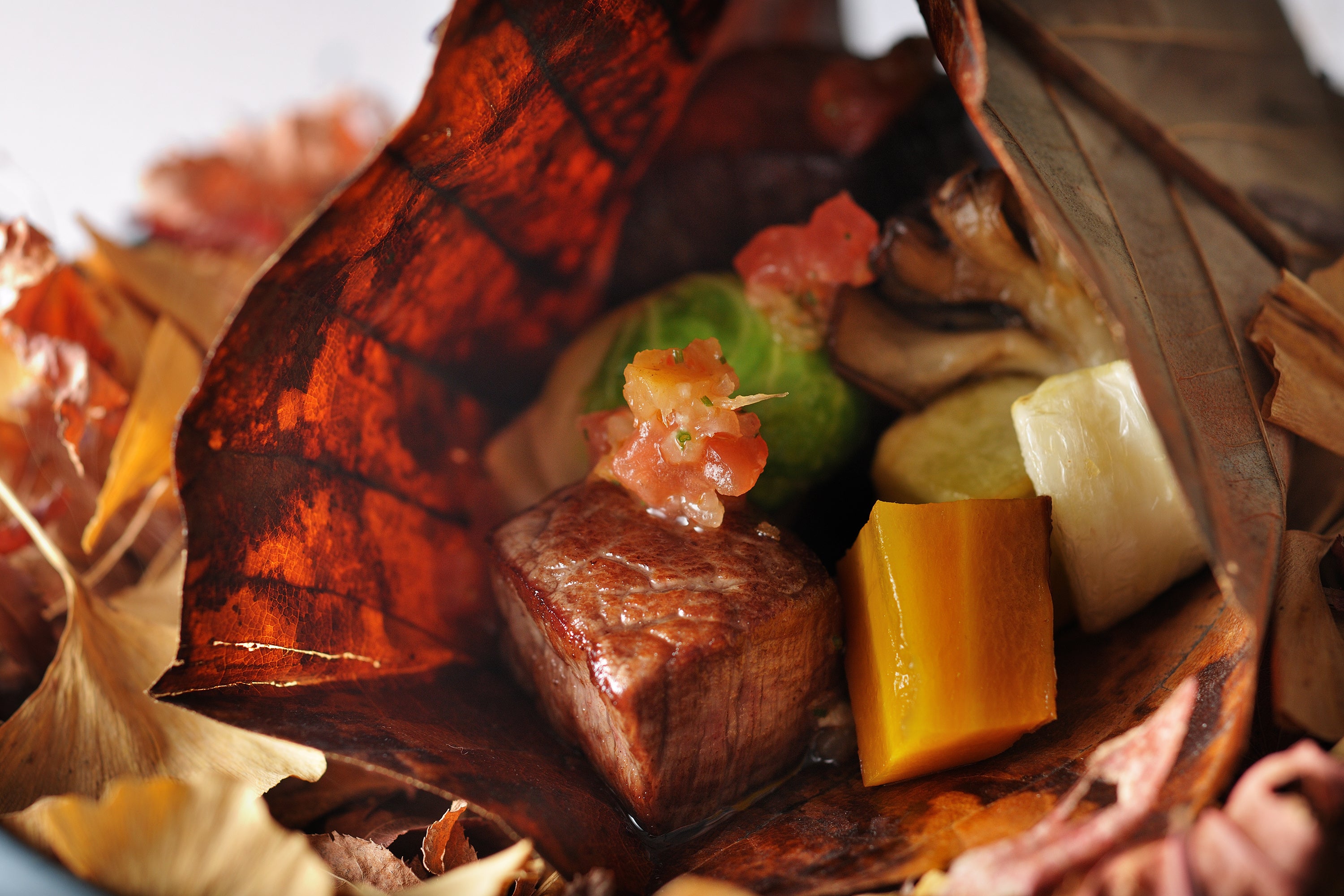 メイン料理は朴葉に包み込み焼き上げた牛フィレ肉のグリルです。味噌でマリネし、じっくり漬け込んだ牛肉に合わせるのは、素揚げした芽キャベツ、高温でローストした黄色人参、スチームしたゆり根など冬に旬を迎えるさまざまな野菜です。朴葉の優しい香りと共に、芽キャベツのほろ苦さや人参の甘味、噛むたびに溢れる牛肉の旨みを堪能できます。
