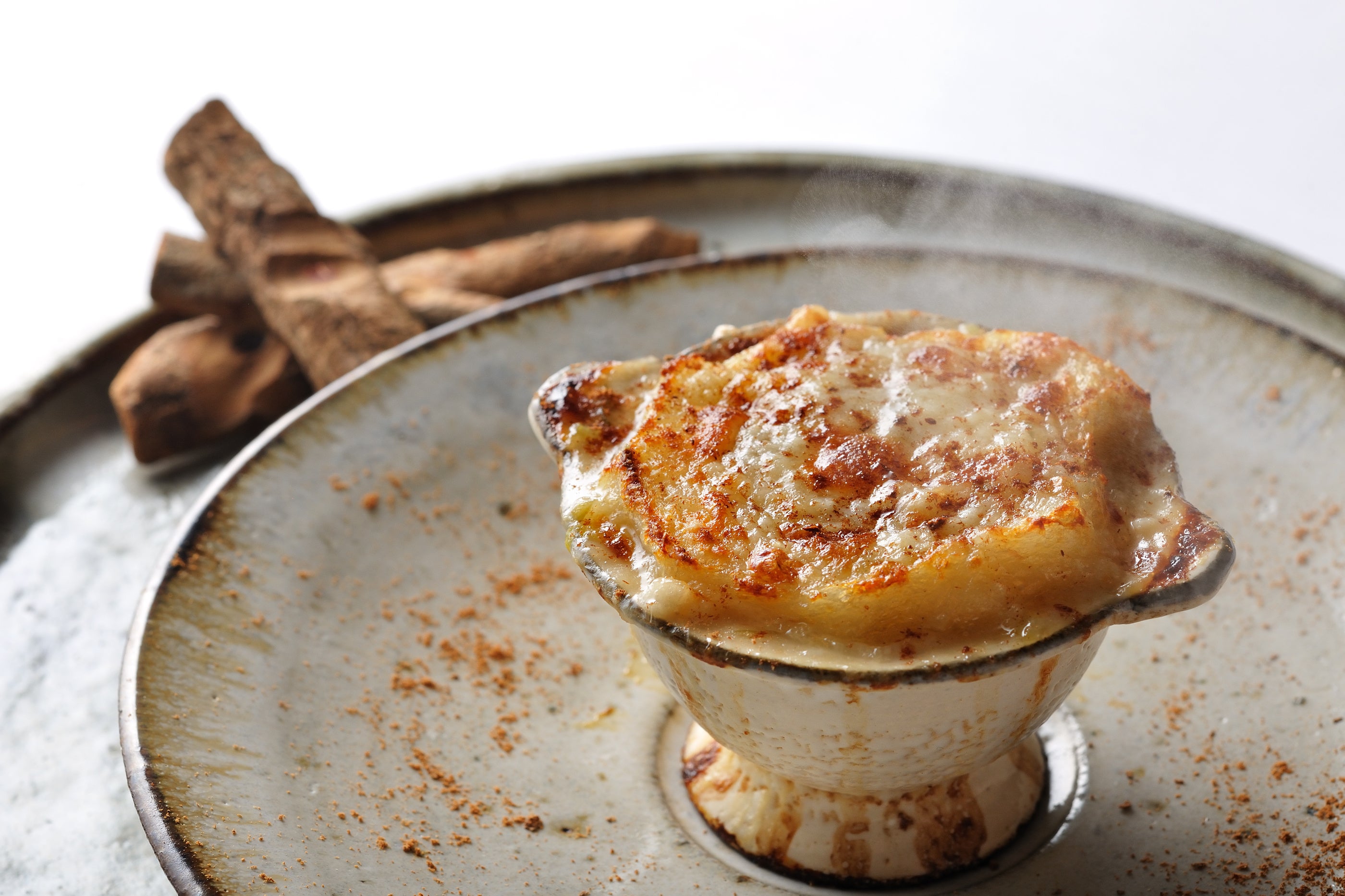トスカーナ州 フィレンツェの伝統的なスープ カラバッチャは、本場では赤玉ねぎを使用しますが、栃木県で生産が盛んなネギを代わりに使用して提供します。スープの上にはバゲットを浮かべ、羊乳を原料とするチーズ ペコリーノロマーノをかけてオーブンで焼き上げ、仕上げにシナモンをあしらった寒い冬にぴったりの熱々の一品です。笠間焼の陶芸作家 酒井敦志之氏の器と合わせてお楽しみください。