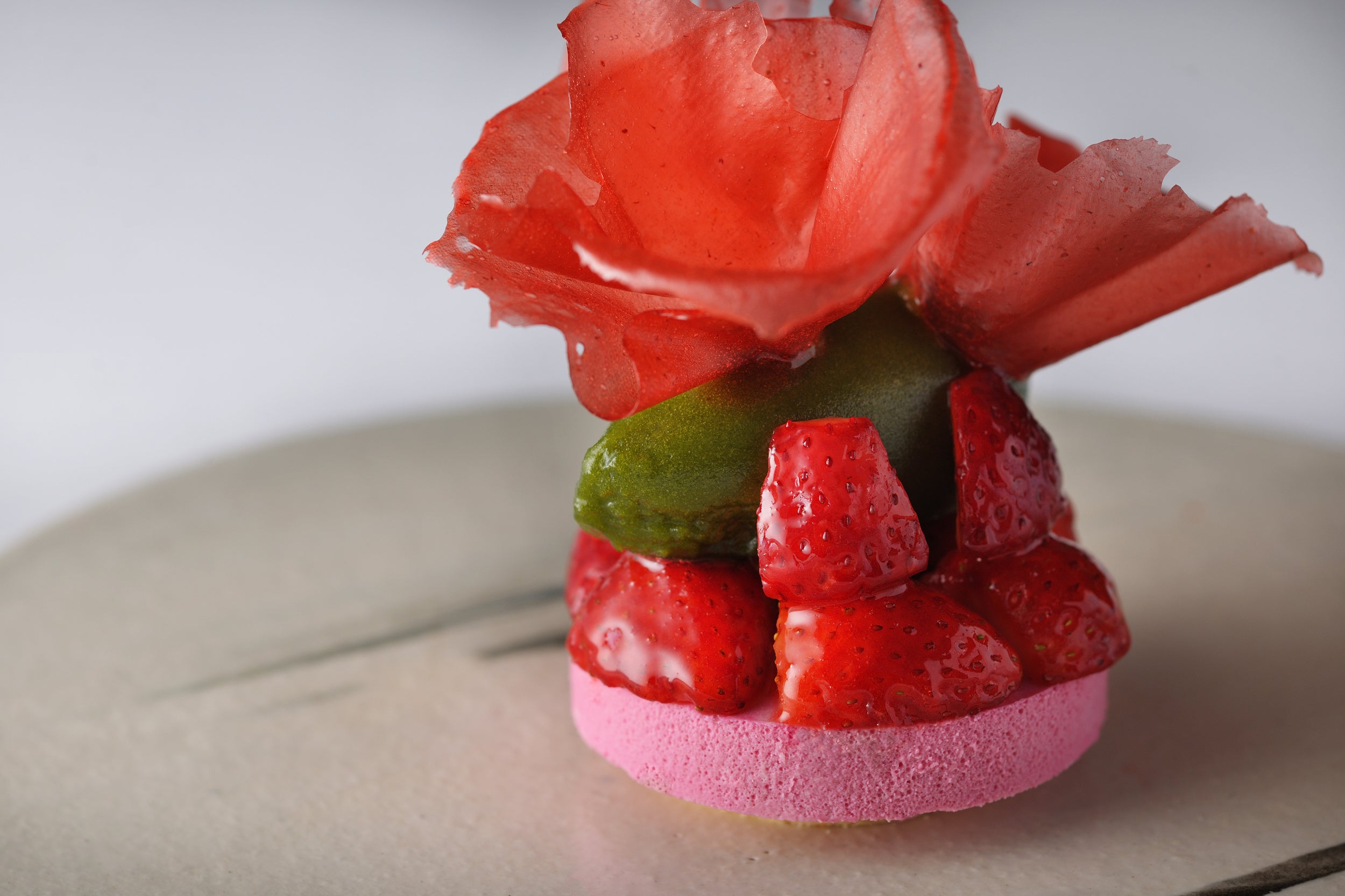 旬の苺をふんだんに使用した苺とビーツのコンポジツィオーネ。口当たりのなめらかな苺とビーツを合わせたムースの上には、スパークリングワインで煮込んだ苺のコンポートをのせます。さらにレモンの爽やかな酸味とミントのスッキリした味わいのソルベには、赤い花が咲き誇るように苺のチュイルを飾り、味だけでなく見た目も楽しむことができる一品です。