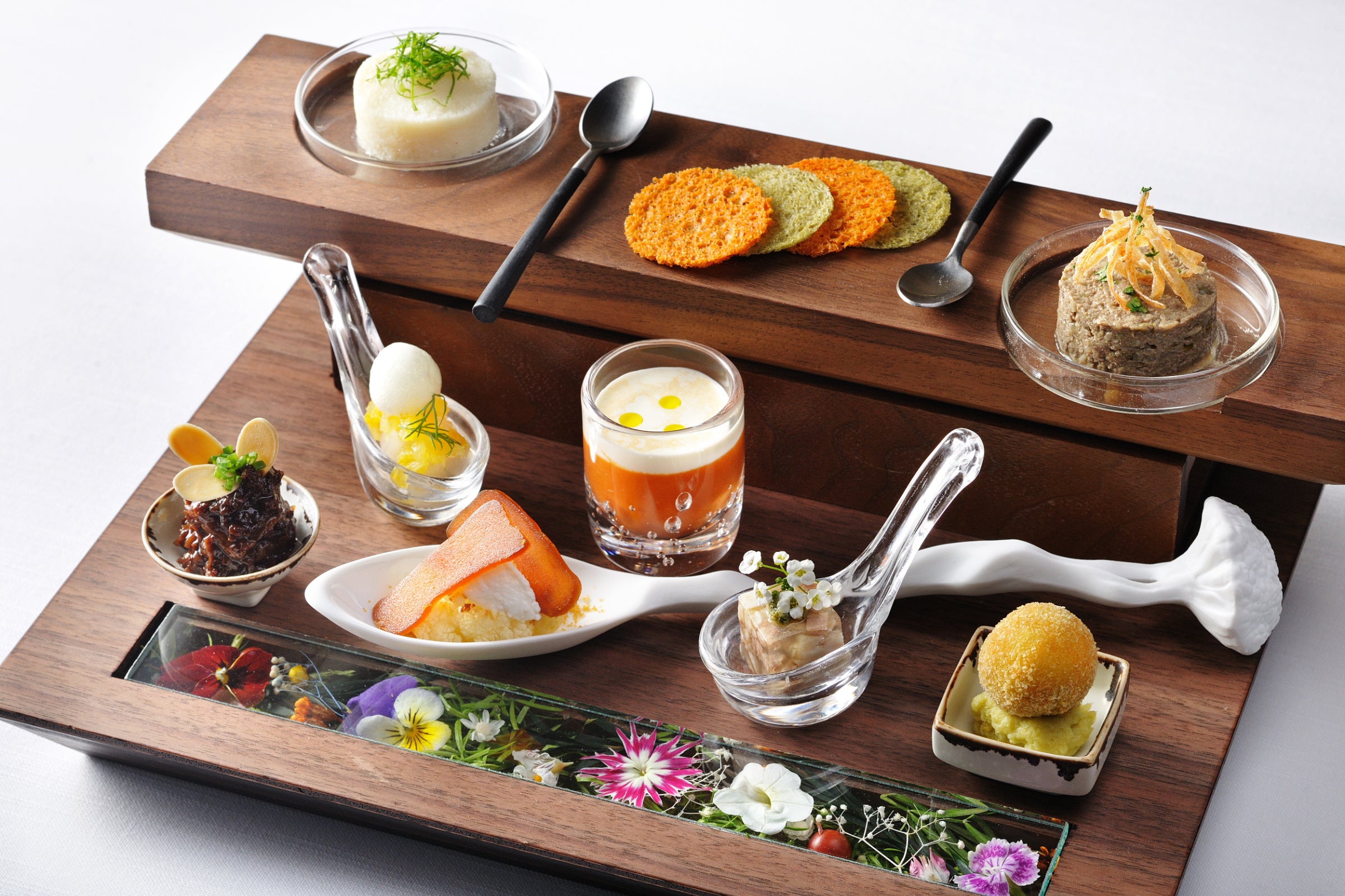 トスカーナ州の 7 つの郷土料理を前菜として盛り合わせて提供します。元来、トスカーナ州では小麦の生産が盛んであり、伝統的なパンもさまざまな調理法で楽しまれてきました。スライスしてこんがりと焼き上げた「パネトスカーナ(上段中央)」、トマトとパンを混ぜ合わせて粥のようにして食べる「パッパ・コル・ポモドーロ(下段中央奥)」などです。ほかにも、バルサミコを使用して煮込んだ「茄子のカポナータ(下段左の丸い器)」や「ハマチとウイキョウのマリネ(下段左奥の小スプーン)」など、彩り豊かに盛り合わせて提供します。