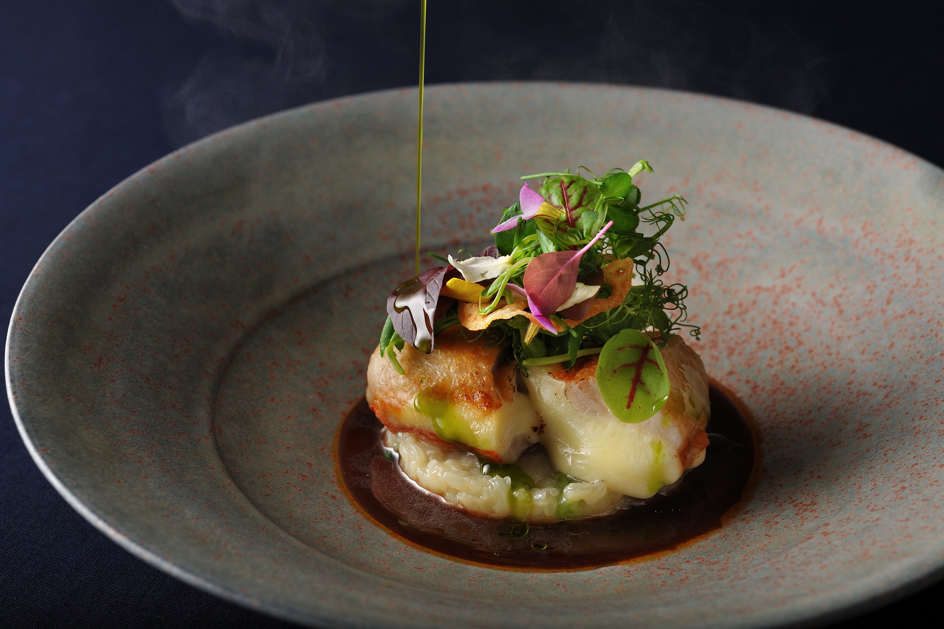 金目鯛でスカルモッツァアフカミータというチーズを挟み、焼き上げました。蕪や蕪の葉が入ったリゾットの上に金目鯛のほか、アマランサス、シブレット、レッドソレルなどを使用したハーブサラダをのせており、それぞれの風味を楽しめます。また赤ワインベースのテガマッチョスープが金目鯛の旨みを引き立て、最後にかけるミントオイルの爽やかな香りを感じながら旬の金目鯛を味わう一品です。