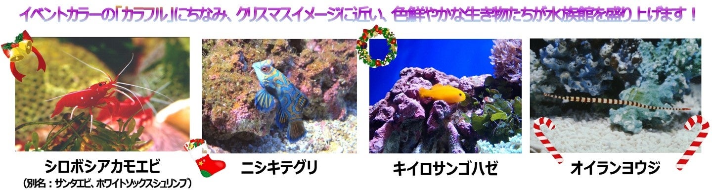 本イベントでは、クリスマスの雰囲気を高めるカラフルな生き物を特別水槽にて展示するほか、クリスマスツリーの設置やアシカによるツリー点灯式、キーワードを集めてプレゼントがもらえるクリスマスプレゼントボックスラリーなど、いち早くクリスマスを感じられるイベントを実施します。