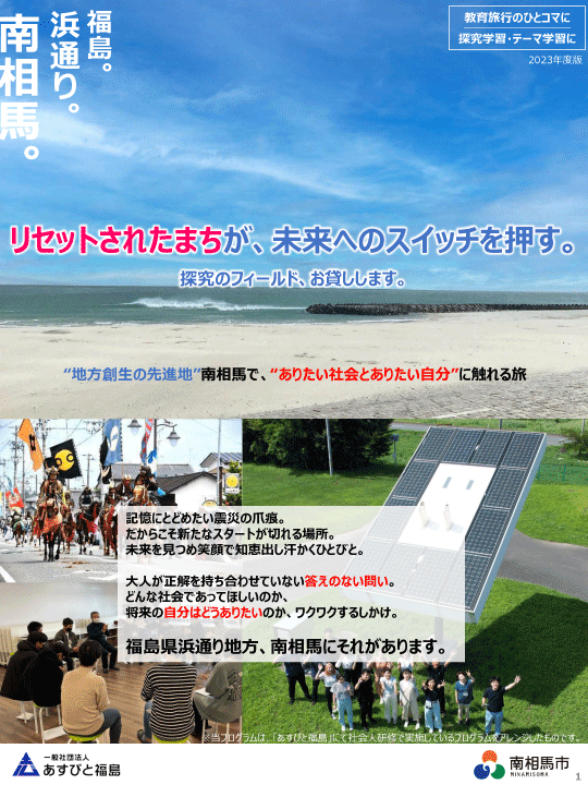 国や東証プライム上場企業をはじめとする会社・組織から2014年度~2022年度で319回、7,274人の社会人研修の受け入れ実績を有する一般社団法人あすびと福島(所在地:福島県南相馬市、代表理事:半谷栄寿)のノウハウに着目し、同法人に協力して探究学習・テーマ学習・キャリア教育に特化した「リセットされたまちが、未来へのスイッチを押す。」など2プログラムを新規造成し、7月に提供を開始しました。