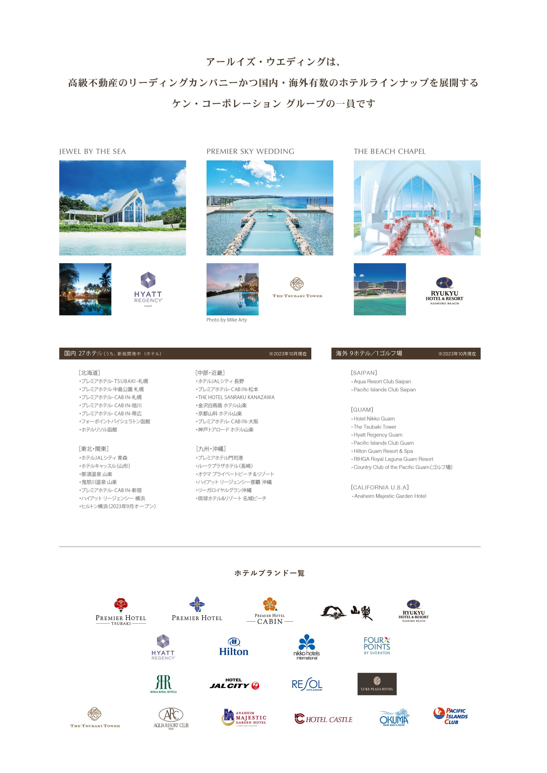 「風までも、思い出になるウエディング」をコンセプトに、ハワイ・グアムの海外挙式・沖縄の国内リゾート挙式を手掛けるウエディングブランド「アールイズ・ウエディング」、オリジナルドレスブランド「アールイズ・ドレス」、映像・写真に特化した「アールイズ・ピクチャーズ」、旅行をサポートするサービス「アールイズ・トラベル」の4ブランドを展開。
