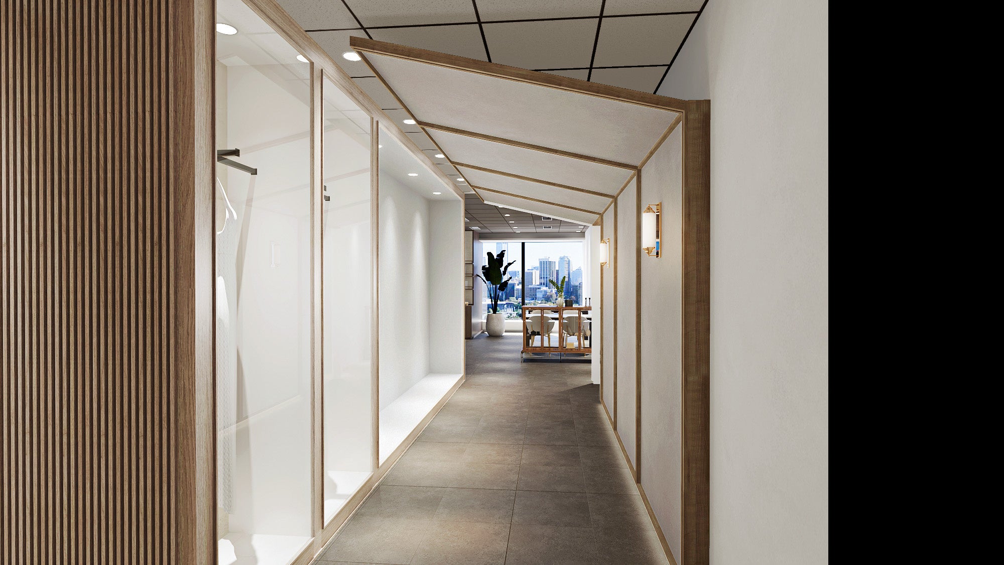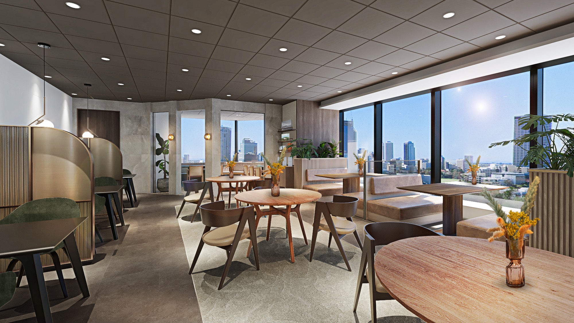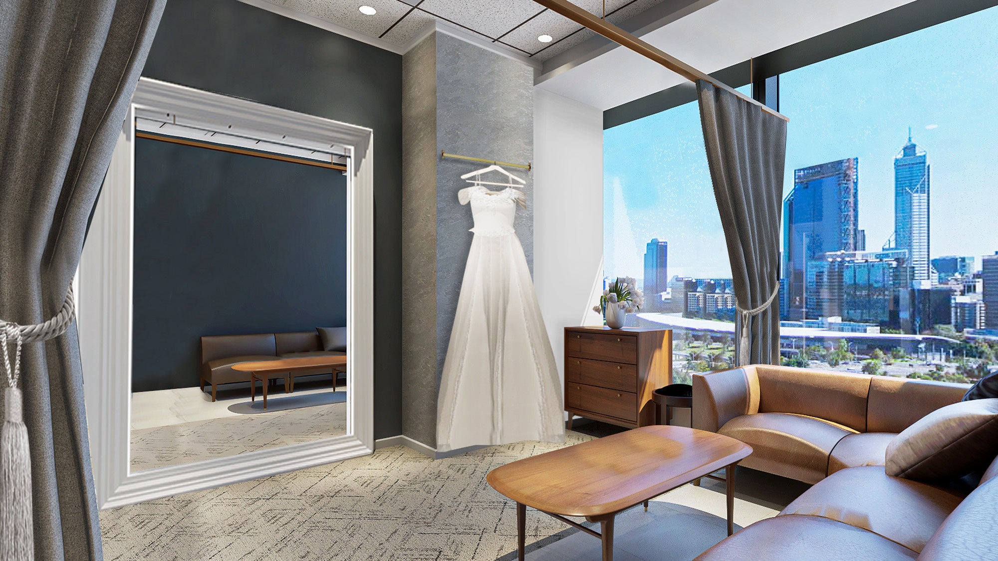 またエントランスからアプローチを抜けると、2面ガラス張りの自然光豊かなウエディングブースエリアが広がります。ウエディングブースは、高層階ならではの眺望を望む窓側ソファ席やサンルームをイメージした開放感あふれるブース席など、エリア毎に趣の異なる家具を配置することで訪れる度に気分を変えて打ち合わせを楽しむことができます。