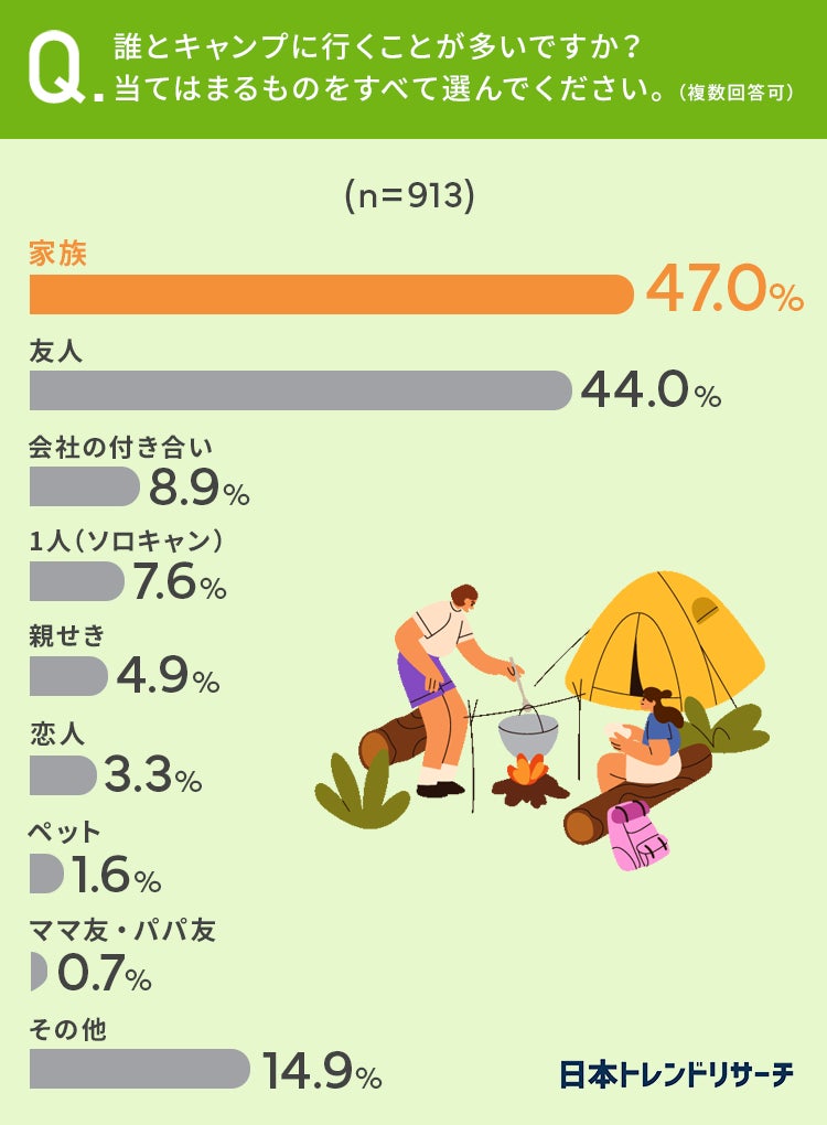 そこで今回はキャンピングカー買取の『A-saito!』と共同で、キャンプをしたことがある全国の男女913名を対象に、「キャンプの人数」についてのアンケートを実施しました。