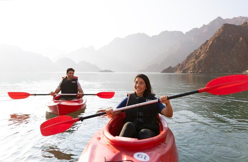 一味違うドバイ旅行を体験したい方におススメなのが、大自然に囲まれた砂漠のオアシスHatta(ハッタ)です。ドバイ市内から車を90分ほど走らせると、緑豊かな山に囲まれたコバルトブルーのダム湖が現れます。カヤックで水中散歩したり、ハイキングやマウンテンバイクで雄大な景色を満喫できたりします。周辺にはおしゃれなリゾート施設も充実しているので、心身をリフレッシュできる空間に身を委ねながら過ごせる非日常感が満載のリゾート地です。