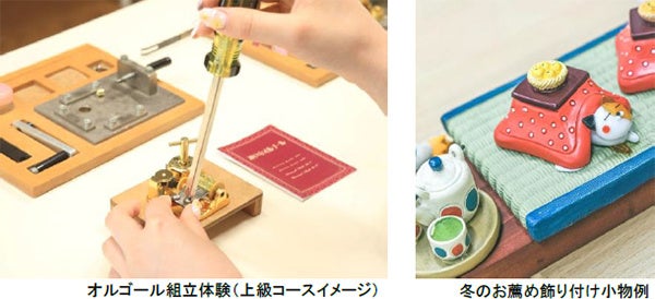 オルゴール職人のサポートのもと、自分だけの音色のオルゴール作りが体験できます。お好みの曲、ケース、コース(一般コース、上級コース)を選んで、完成したオルゴールは持ち帰りできます。下記日程は、特設のこたつ席(1台、先着順)で、あたたまりながらじっくり体験ができます。冬にお薦めの飾りつけ小物もご用意しています。