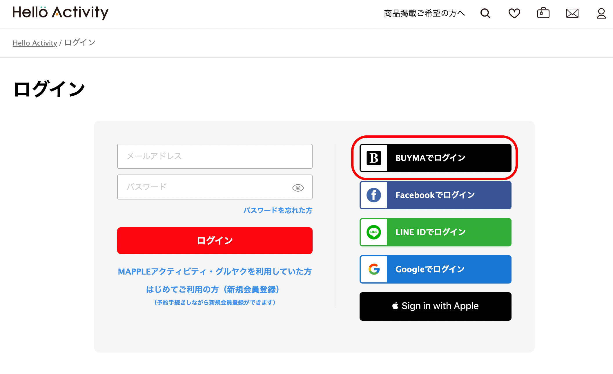 『ハロアク』のログイン画面で︎BUYMAアカウントで会員登録およびログインが選べるようになり『BUYMA』アカウントの認証のみで『ハロアク』にセキュアかつ簡単にログインができるようになります。