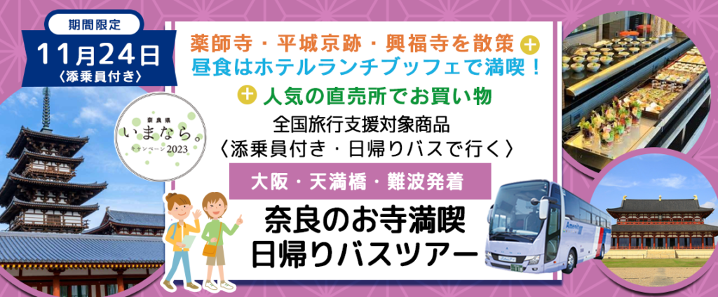 ==薬師寺〈10:40頃着/11:30発(拝観) 〉==平城宮跡資料館 〈11:45頃着/12:30発(拝観) 〉==ピアッツァホテル奈良〈12:50頃着/14:30発(昼食) 〉==興福寺〈14:40頃着/15:20発(見学・参拝) 〉==旬の駅ならやま〈15:40着/16:20発(お買い物) 〉==大阪メトロなんば駅OCAT周辺 17:20頃==JR大阪駅桜橋口周辺 17:40頃着==京阪・大阪メトロ「天満橋」駅周辺18:00頃着