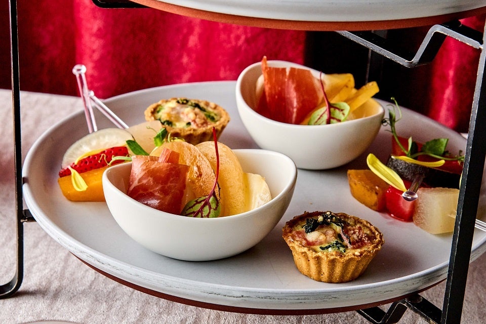 セイボリーには、カラメルのほろ苦さとチーズ、生ハムの味わいのマリアージュが楽しめるリンゴのコンポートや、爽やかな味わいの“いちごと神奈川野菜のピクルス”と“ベーコンと菜の花のキッシュ”をご用意します。