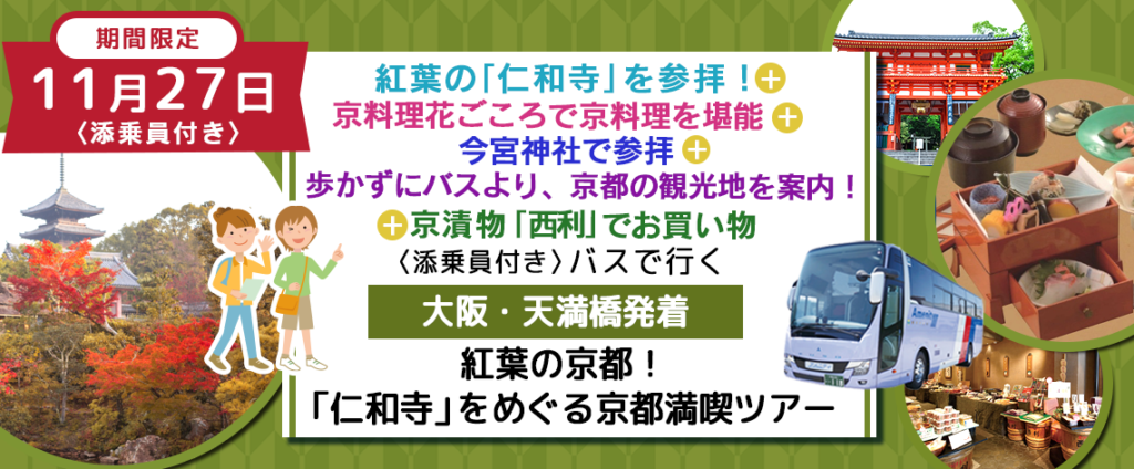 おひとり様9,900円 11月27日(月) 《京都・紅葉巡り》〈梅田・大阪駅・天満橋発着・添乗員付き〉 仁和寺と八坂神社で紅葉散策+京都人気紅葉スポットを車窓見学+ご昼食をご堪能+有名漬物店でお買物日帰りバスツアー