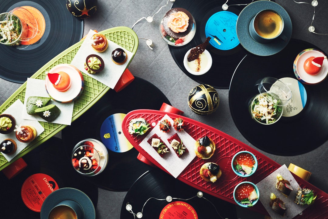 スケートボードに載せられたセイボリーやスイーツの数々が、クリスマス気分を演出するデコレーションへと変化し、アフタヌーンティーをより一層華やかにします。