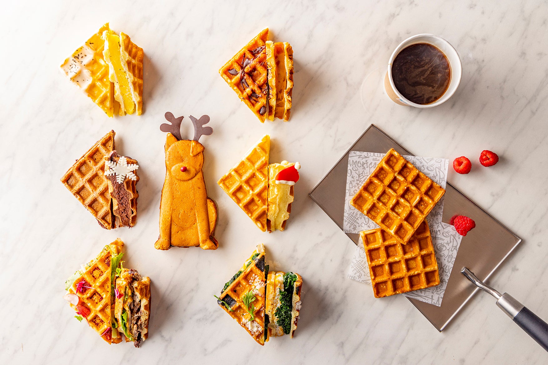 ケールやチーズなどを使用したベジタリアンの方でも召し上がれるワッフルと、ラム肉やハリッサを使用した地中海料理からインスパイアされたワッフルは、クリスマスカラーを想わせるデザインで。シグネチャーである【ハチ公ワッフル】は、ピスタチオクリームとラズベリーコンフィをサンドすることで、クリスマスムードを演出するデザインとなっております。