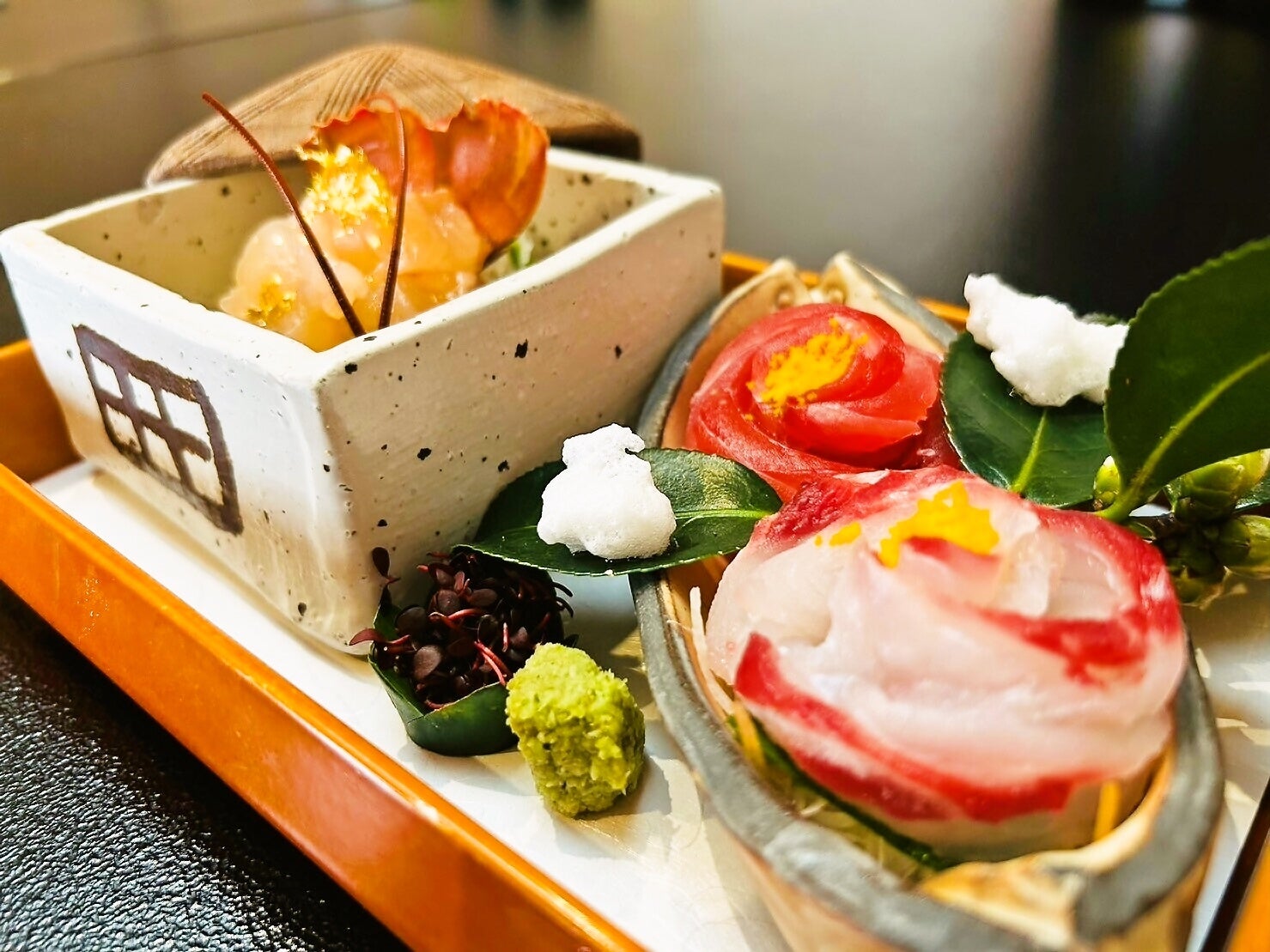鯛と鮪を椿の花に見立て、茅葺屋根の器には伊勢海老が隠れております。