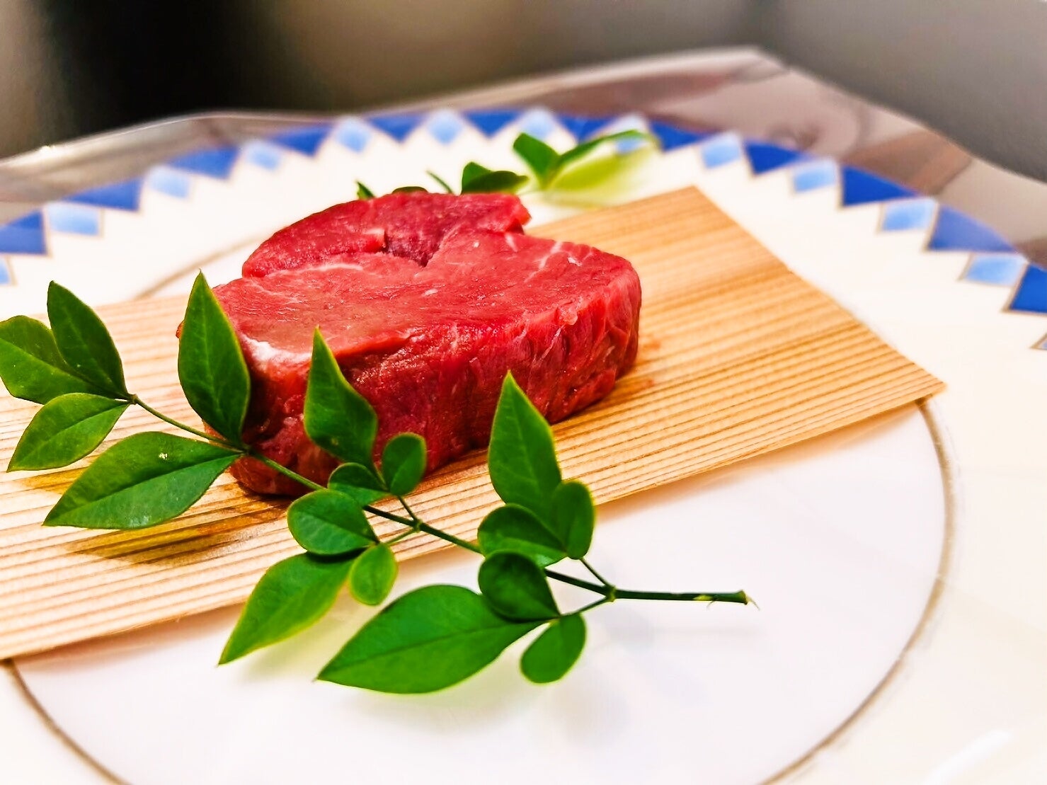 黒毛和牛を杉板に乗せて塩焼きし肉本来の味を楽しむとともに、杉の香りも楽しんでいただけますようセロハン包みにしております。
