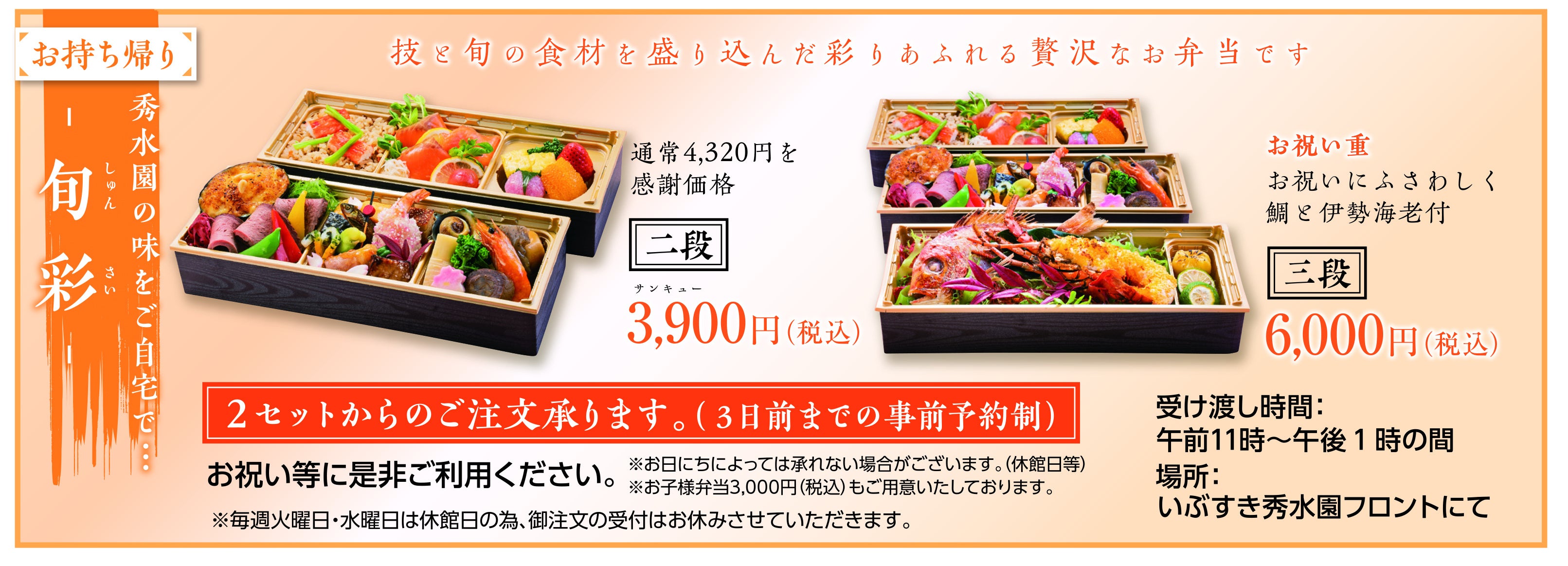 宿泊プランだけでなく、食事のみ(ご夕食)のご提供や豪華旬彩弁当(2段、3段)もご準備しております。
