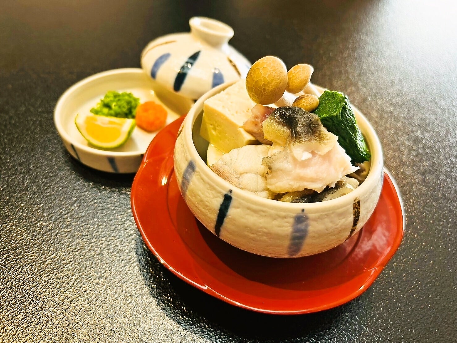 昔ながらの瓢箪蒸しの器で河豚を蒸し煮。お好みで割ポン酢を掛けて。