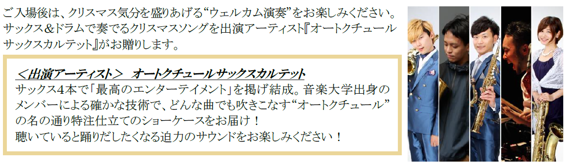 今回はその人気コンテンツに『オートクチュールサックスカルテット』の生演奏が加わり、より洗練されたサウンドでお贈りいたします。