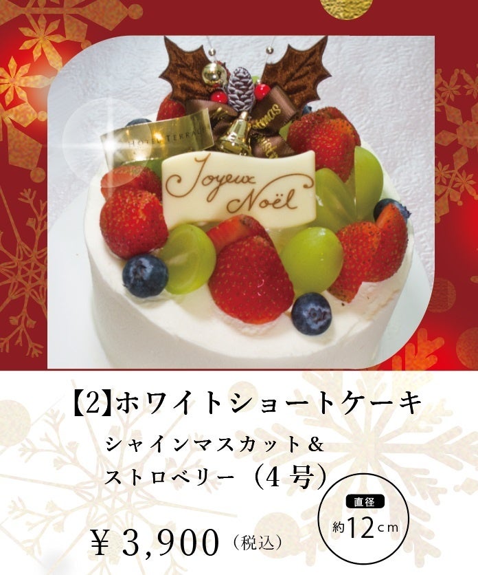 ホテルシェフによる、クリスマスの定番ショートケーキ。シャインマスカットといちごのコントラストがかわいらしいケーキ。スポンジは3層になっております。 クリーム本来の⾵味を⼤切にした「よつ葉の⽣クリーム」、県産いちご使⽤。