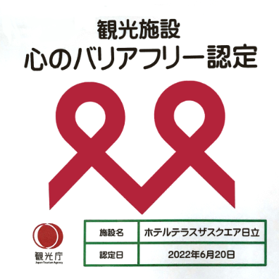ホテルテラスザスクエア日立はバリアフリー対応や情報発信に積極的に取り組む姿勢のある観光施設を対象とした「観光施設における心のバリアフリー認定制度」の認定を得た宿泊施設です。ご高齢の方や障害のある方がより安全で快適な旅行をするための環境整備に努めております。