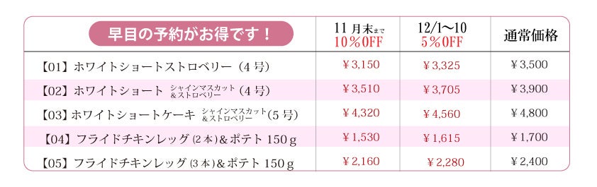 【早割り】11月末までのお申込で10%、12月1~10日のお申込で5%割引いたします。
