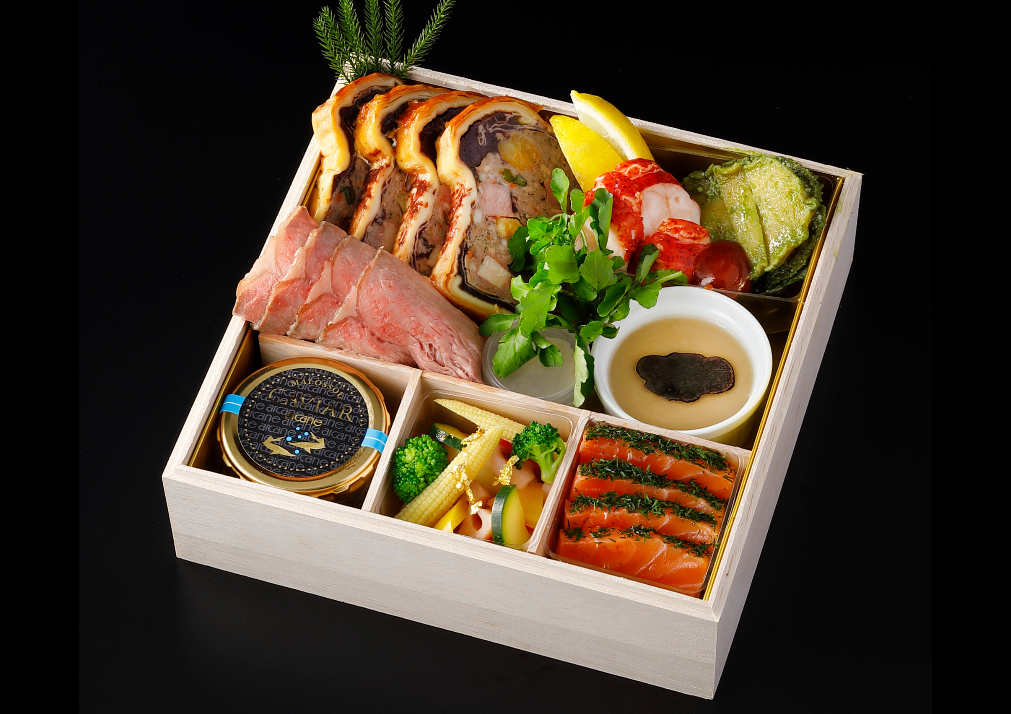 ココット仕立てにしたフォアグラのテリーヌや、オマール海老、キャビア、ハーブでマリネしたサーモンなどが愉しめる洋風の特製おせち。